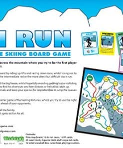 Ski Run es una carrera llena de acción por la montaña donde intentas ser el primer jugador de regreso al resort para el Après Ski. Elige tu ruta en el tablero del mapa de pistas subiendo en los telesillas y bajando por las pistas, ¡tratando de no caerte! ¿Tomarás la fácil pista azul, la intermedia pista roja o la más directa pero difícil pista negra? ¡Ten cuidado con el hielo, las tormentas de nieve, los saltos y la gran helada, mientras intentas evitar perderte o chocar con tus competidores! Sigue al yeti para encontrar sus atajos y alquila motos de nieve o helicópteros para ponerte al día. Haz una parada en una estación de esquí para retrasar a tus rivales y mantén tus ojos abiertos ante las oportunidades para saltarte las colas o seguir al líder. El liderazgo cambia constantemente en este juego dinámico de fortunas fluctuantes, donde intentas usar las cartas correctas en el momento adecuado para mantenerte un paso adelante de tus oponentes. Un juego rápido, brillante e interactivo para toda la familia. Juega en casa o de vacaciones para una diversión esencial después de esquiar para todos. Un gran juego para 2 a 5 jugadores. Edad recomendada: 9 a 100 años. Contenido: Tablero del mapa de pistas, 16 cartas de carrera de esquí, 10 cartas de telesilla, 20 cartas de eventos, 4 cartas especiales y 5 cartas de caída, dado de bola de nieve de 12 lados, hoja de reglas, fichas de juego.