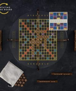 SCRABBLE Edición Prisma de Vidrio te permite disfrutar del Juego de Palabras Favorito de América con un estilo y elegancia modernos. Este set cuenta con un tablero de juego redondo de vidrio templado de primera calidad que descansa sobre una base de madera maciza teñida de nogal que permite que todo el tablero de vidrio gire. Se incluye el complemento estándar de 100 fichas de letras de madera teñida y 4 bastidores de fichas de madera maciza. Estas fichas de SCRABBLE se almacenan en una bolsa de tela de microgamuza con cordón. El set también incluye un bloc de puntuación premium con lámina de estampado en relieve y un lápiz para registrar los resultados de tus épicas batallas de palabras.