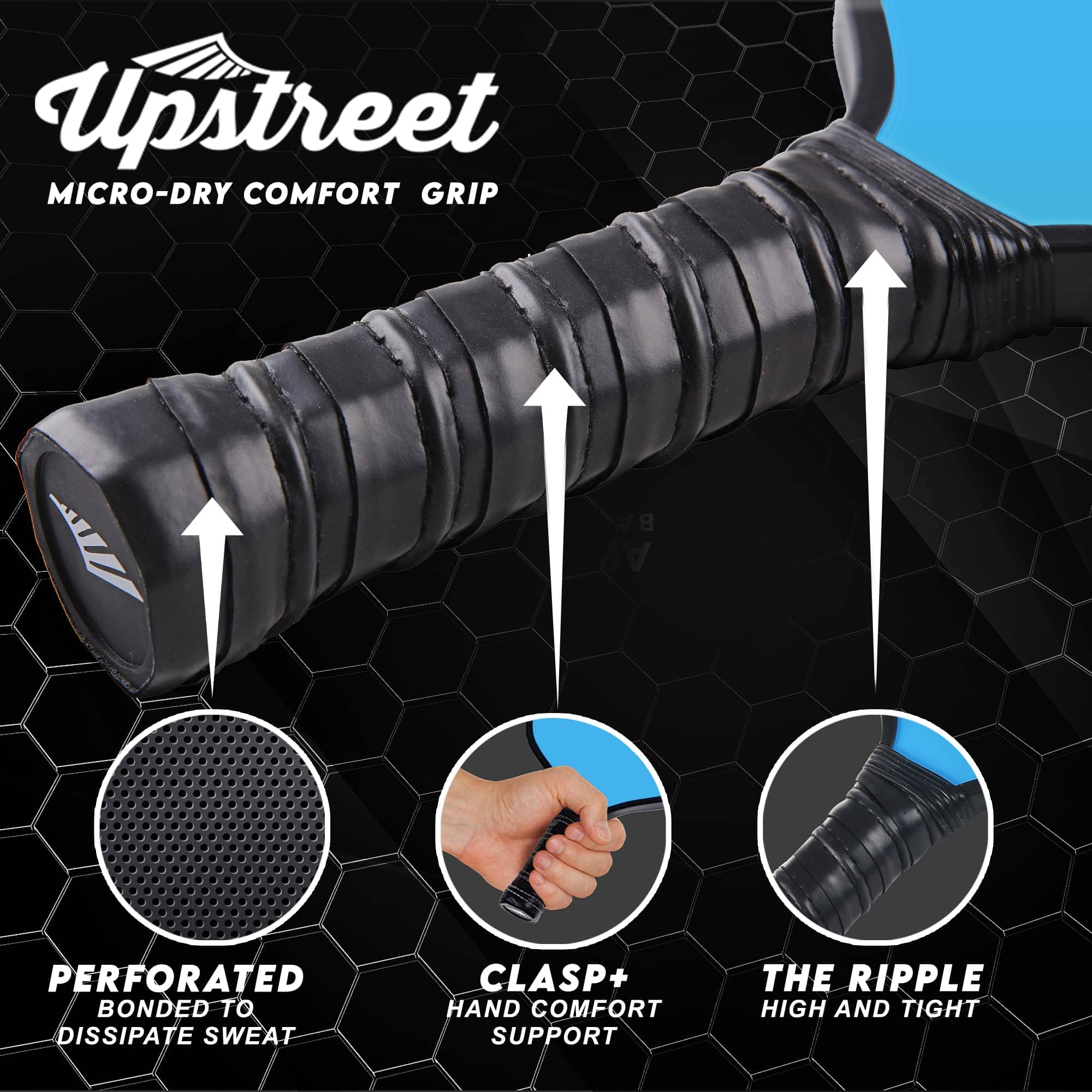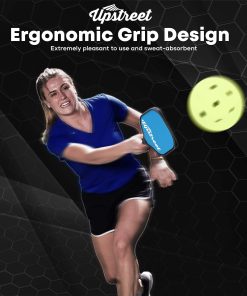 4. DISEÑO DE AGARRE ERGONÓMICO: La raqueta o juego de pelotas de pickleball de Upstreet tiene un agarre acolchado de alta gama que es extremadamente agradable de usar y absorbente del sudor. Esta pala de pickleball tiene una longitud de agarre de 4.6 pulgadas y un círculo de agarre de 4.4 pulgadas, lo que la hace adecuada para manos de tamaño promedio.