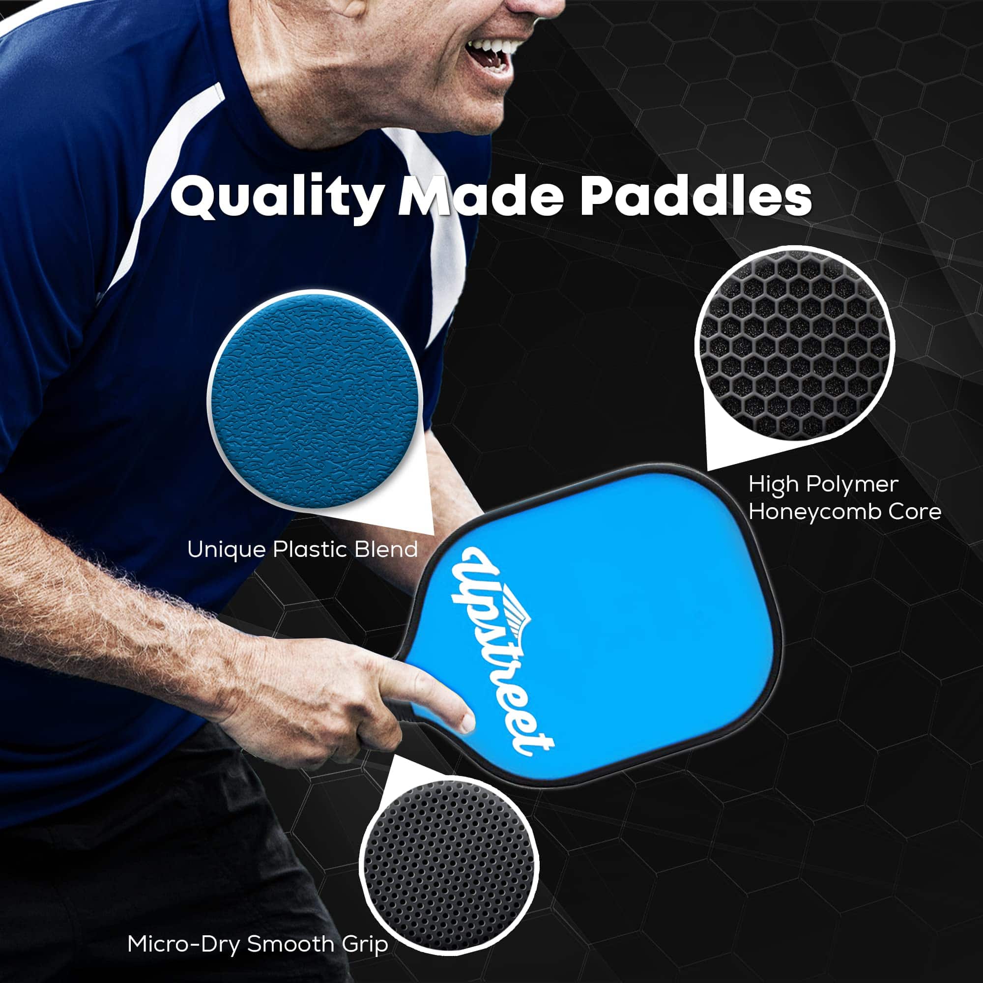 2. LIGERO Y DURADERO: Las palas de Upstreet tienen un núcleo de nido de abeja de polímero de alta calidad y están bien equilibradas en ligereza y durabilidad. Cada pala pesa entre 7.5 y 8.2 onzas. La combinación de un agarre suave y agradable y grafito tejido ligero proporciona un juego conveniente y extenso.