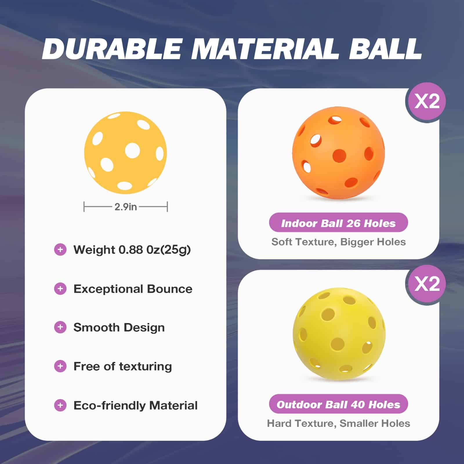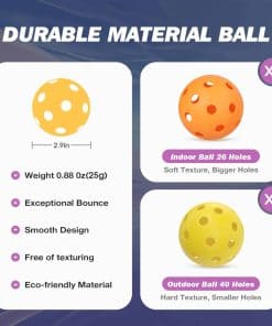 Esta pala de pickleball combina un diseño avanzado con materiales de alta calidad, lo que la hace adecuada para jugadores de todos los niveles, ya sea que seas principiante o profesional. Ya sea que juegues en interiores o exteriores, la pala diseñada cuidadosamente garantiza un rendimiento óptimo en cada golpe. Presenta un diseño de 26 agujeros para jugar en interiores y un diseño de 40 agujeros para jugar al aire libre, lo que garantiza un control superior y estabilidad de vuelo bajo diversas condiciones.