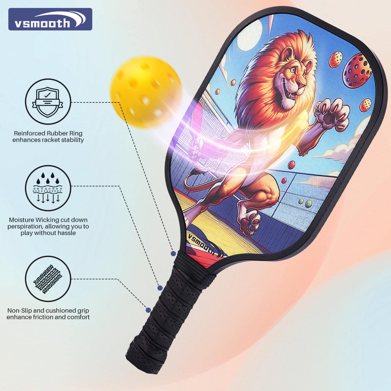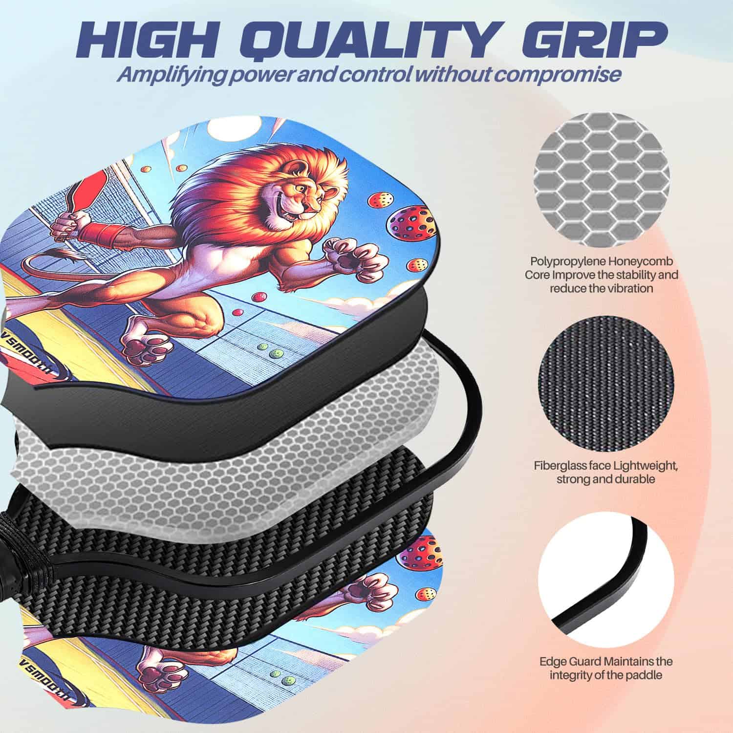 3. Pala de Material de Alta Calidad – Nuestra pala tiene la superficie de fibra de vidrio, que tiene alta elasticidad y estabilidad. Y el diseño interno de nuestra pala es una estructura de panal, proporcionando la mejor dulzura y durabilidad para la pala, ofreciendo un control de bola más preciso y fuerza de golpeo.