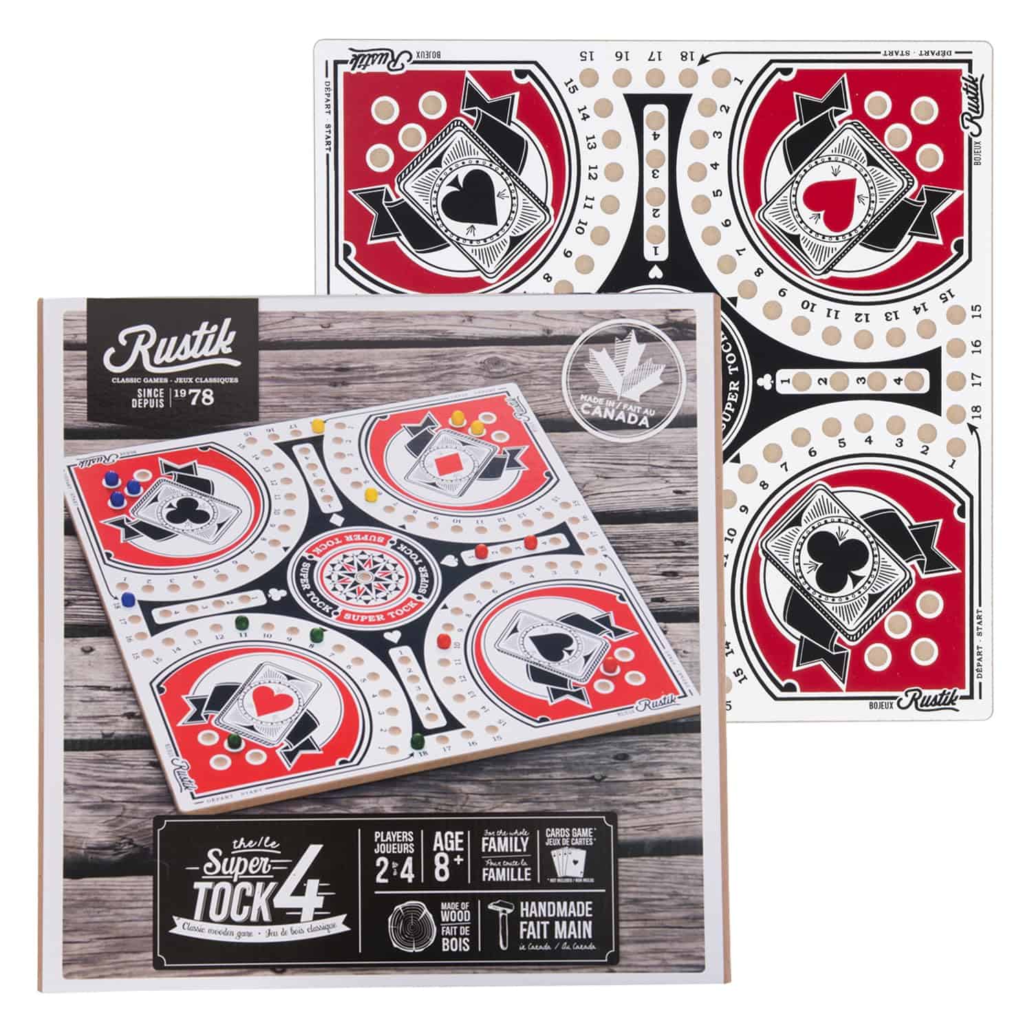 JUEGO DE PARCHÍS TOCK RUSTIK PARA 4 JUGADORES – TABLERO DE 20 PULGADAS – ¡Un juego clásico que atrae a toda la familia! Afila tus habilidades de estrategia y precisión en una carrera hacia la meta. El jugador que logre llevar todas sus canicas alrededor del tablero primero, gana. Para llegar allí, debes utilizar las mejores estrategias y atajos que permiten las reglas y evitar ser atrapado por las canicas de otros jugadores. Orgullosamente hecho en Canadá con materiales de calidad y bellamente elaborado para exhibir cuando no se está jugando. 16 canicas en 4 colores diferentes (4 por color y por jugador), tablero de juego de madera de 50.8 cm x 50.8 cm – 20 x 20 pulgadas. NOTA: Se requieren cartas, no incluidas.