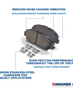 Las pastillas de freno Wagner QS están diseñadas y probadas para restaurar el rendimiento como nuevo. Estas pastillas están desarrolladas con un proceso de post-curado del 100% para garantizar un rendimiento de fricción uniforme a lo largo de la vida útil de la pastilla y están diseñadas para reducir la vibración que causa ruido.
