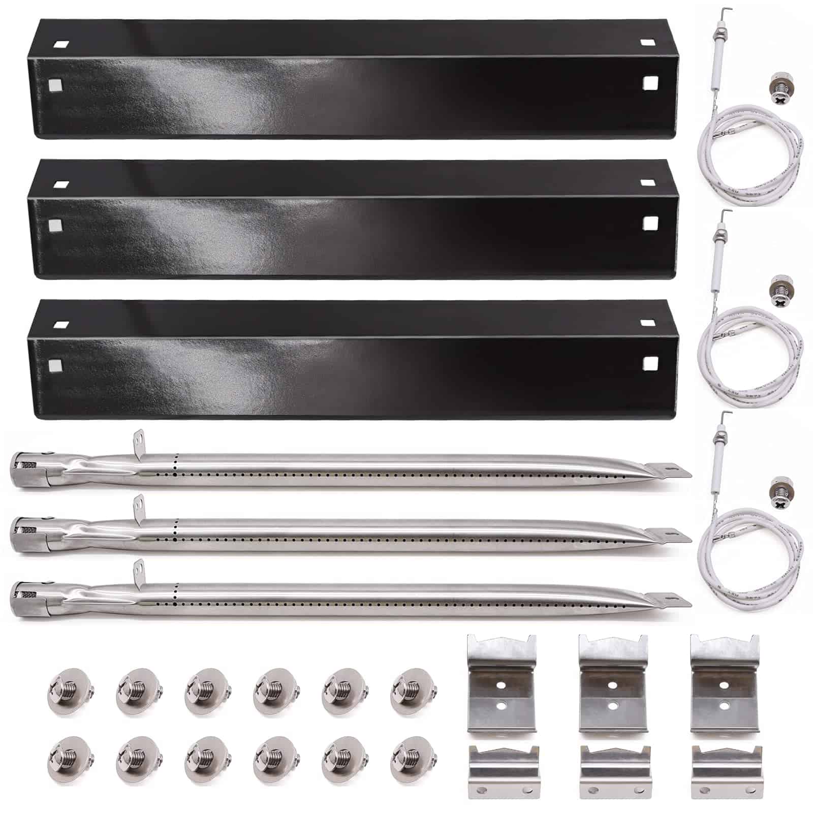Juego de piezas de repuesto para parrilla Adviace compatible con modelos de parrilla Char Griller y King Griller. Este kit incluye todo lo necesario para reemplazar los quemadores, los escudos de llama, los encendedores y los soportes de tubo de quemador / escudo de llama de su parrilla de 3 quemadores. Los quemadores tienen una longitud de 20 1/8″ y un diámetro de 1″. Los escudos de llama miden 18 15/16″ de largo x 3 7/8″ de ancho. Los cables del encendedor son de 31.5″ de largo.