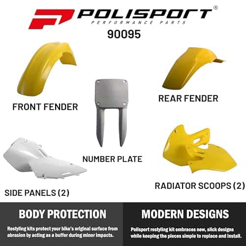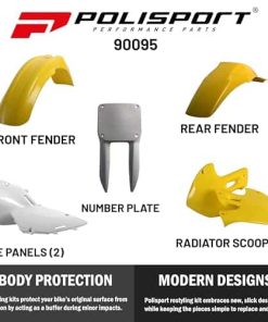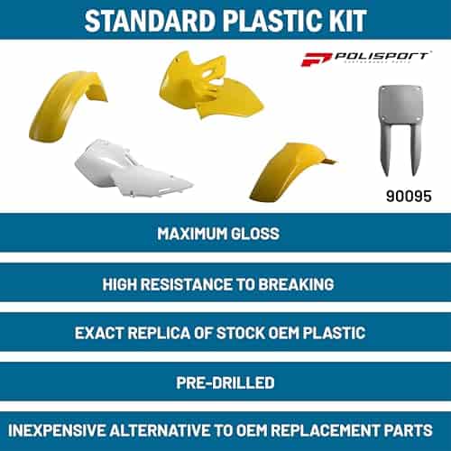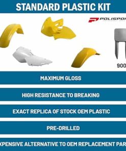 Polisport se enorgullece de presentar el Duradero Polipropileno Brillante (DGP), la primera composición de plástico para off-road que incorpora un brillo máximo y una alta resistencia a la rotura. Calidad de moldeo por inyección para un ajuste OEM perfecto. Réplica exacta de los plásticos OEM originales. Alternativa económica a las piezas de repuesto OEM. Perforado previamente para un montaje perfecto cada vez. Kits incluyen guardabarros delantero y trasero, paneles laterales, carenados de radiador, y placa de número. Color: Amarillo
