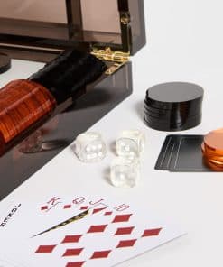 CARA DE PÓKER Lucite es una versión de resina de acrílico de alta calidad, desarrollada en la década de 1930. Superior debido a su resistencia y transparencia, así como a su resistencia a los rayos UV, al agua y a los arañazos, Lucite es la mejor versión de resina de acrílico disponible en el mercado hoy en día. Es un elemento popular en el diseño de interiores y mobiliario, e icónico por su aspecto retro-moderno que recuerda a la época de la posguerra de los años 50. Nuestra gama de lujosos juegos de Lucite de edición limitada en el nuevo tono Whisky Noir humeante están inspirados en la comodidad acogedora de tomar whisky junto a la chimenea, convirtiéndolo en el regalo ideal para cualquier conocedor de licores. Los ricos tonos transparentes marrones y negros añadirán un nivel instantáneo de sofisticación a cualquier habitación de tu hogar. El juego de póker de edición limitada está diseñado con estilo en mente, convirtiéndolo en una pieza única para destacarse en tu hogar durante todo el año. Con estilo de sobra, este kit de lujo está garantizado para ganar en la mesa y llevar tus noches de juegos a alturas envidiables. Sus encantadores tonos cálidos de sepia y humo distraerán a tu competencia, permitiéndote hacer bluff y ganar! Información del producto Incluye x100 fichas de póker, x1 ficha de crupier, x2 barajas de cartas y x5 dados. Tamaño compacto para viajes. Acrílico Lucite transparente de alta calidad. Para mantener en condiciones óptimas el Lucite, manténgalo alejado de la luz solar directa. Manténgalo limpio con un paño suave y seco. Diseñado en Sídney, Australia. Dimensiones y peso del producto Dimensiones del producto 20,5 x 20 x 5 cm / 8,07 x 7,87 x 1,97 in Dimensiones del paquete 22,5 x 6 x 22 cm / 8,86 x 6 x 8,66 in Peso del paquete 1,8 kg / 3,97 lbs Materiales Acrílico, PVC
