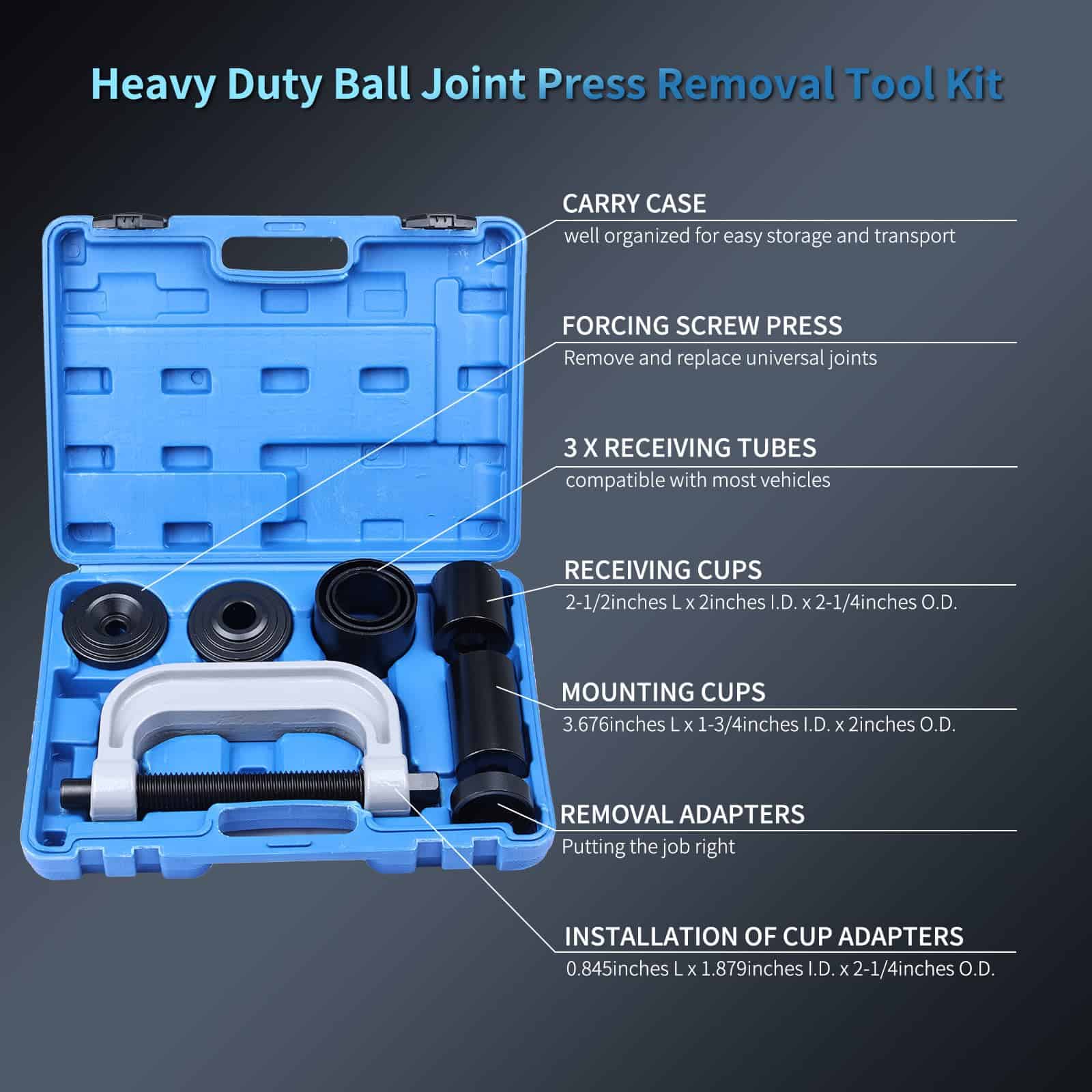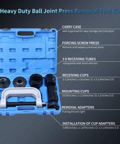 1. APLICACIÓN El Set de Prensa de Junta de Rótula Herramienta de Junta / Herramienta de Extracción de Buje con Adaptador de 4WD puede quitar fácilmente partes ajustadas a presión, incluidas las juntas de rótula, juntas universales, pasadores de anclaje de frenos y más en la mayoría de los vehículos de tracción trasera (2WD) y tracción en las cuatro ruedas (4WD) sin quitar el brazo de control del vehículo.