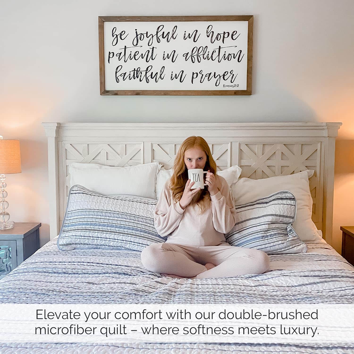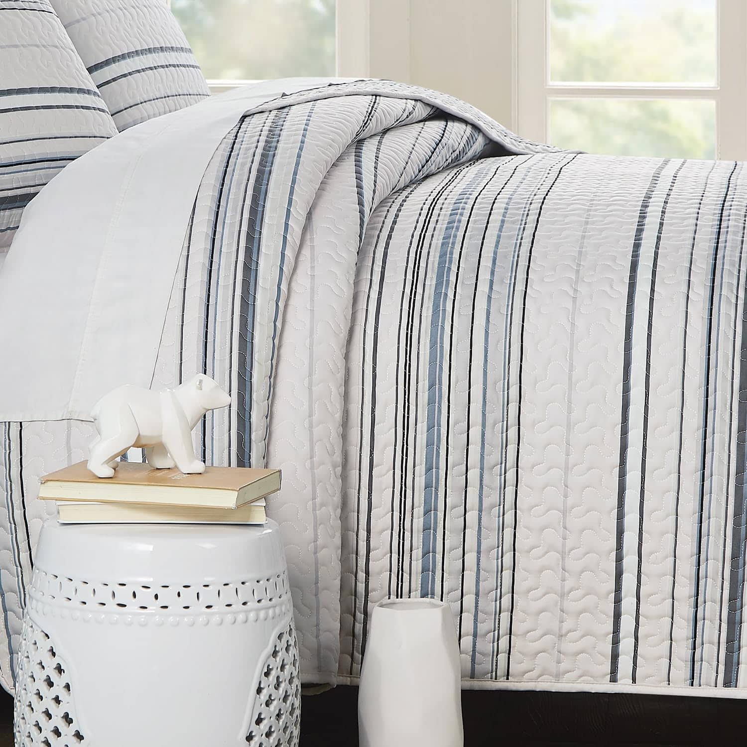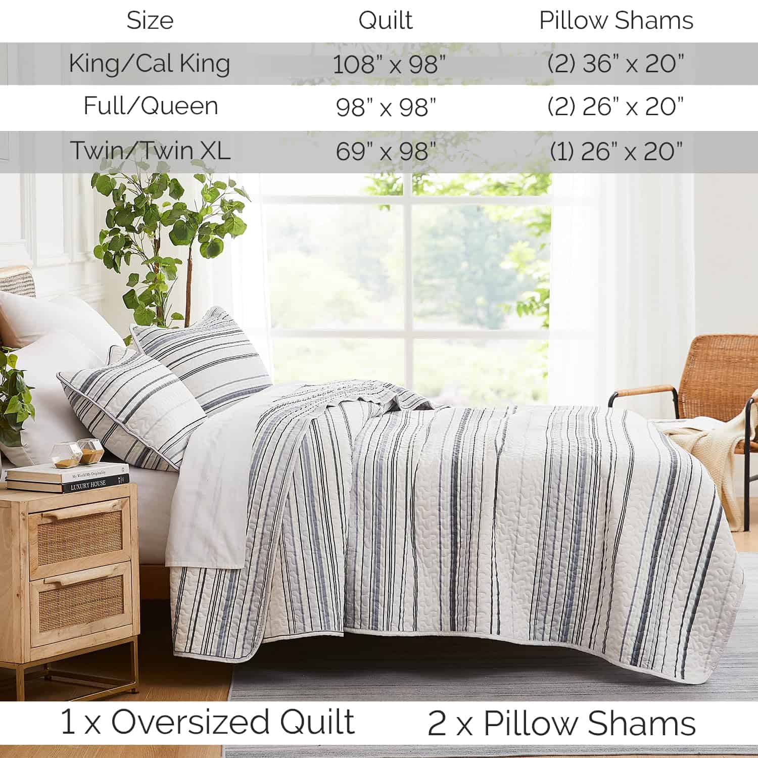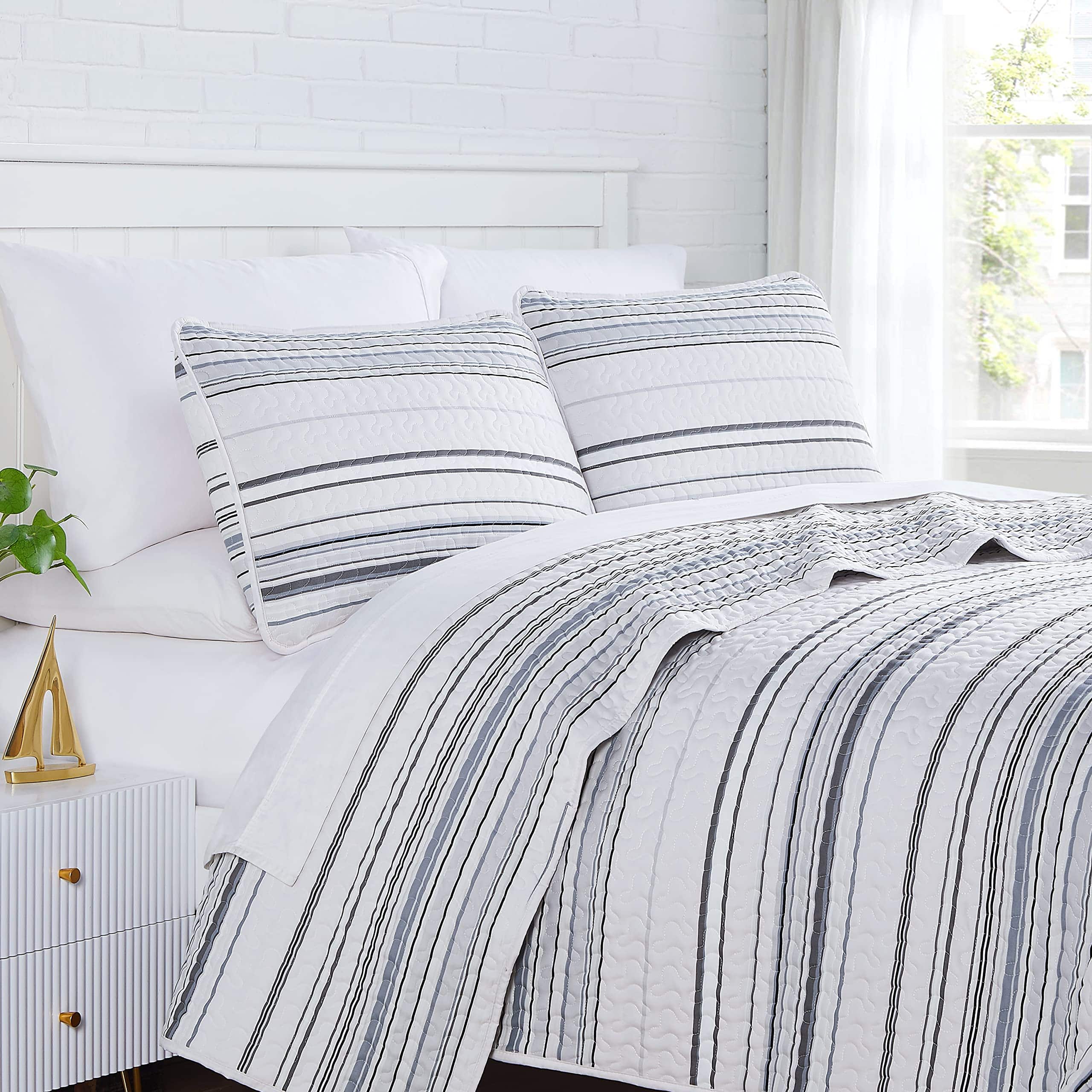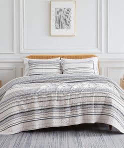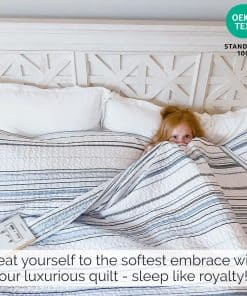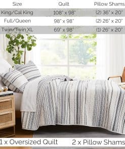 1. Gorgeous Bedding Makeover in a Bag: Nuestro set de quilt king size costero incluye todo lo necesario para una renovación elegante de tu dormitorio, desde el quilt king/California King hasta las fundas de almohada a juego para una estética de decoración costera de playa. 2. Dreamy Soft, Microfibra Doble Cepillado: Microfibra ultra cómoda de 110 GSM, este set de quilt King/Cal King se vuelve más suave con cada lavado. Tela no encogible mantiene su tamaño para una cobertura total. Quilts ligeros, acogedores pero no pesados, perfectos para todas las estaciones. 3. Cuidado Fácil y Ajuste Versátil para Camas King: Nuestro set de quilt king size se ajusta tanto a camas king como a California king. La microfibra lavable a máquina y apta para secadora hace que estos quilts king sean suaves al tacto, hermosos de ver y fáciles de mantener frescos y nuevos. 4. Set de Quilt Oversize King Incluye: 1 Quilt 108″ Ancho x 98″ Largo; Dos Fundas de Almohada King Size 20″ x 36″; La microfibra no encoge asegura que estos quilts mantengan su tamaño generoso, para una cobertura total en los lados y pies de tu cama King o Cal King. 5. Beautiful Bedding Bliss: Eleva tu dormitorio con nuestro set de ropa de cama de diseño costero para cama king de 3 piezas, que incluye un quilt oversized king adornado con un hermoso patrón a rayas costeras, perfectamente hecho a medida para complementar la decoración de tu dormitorio.