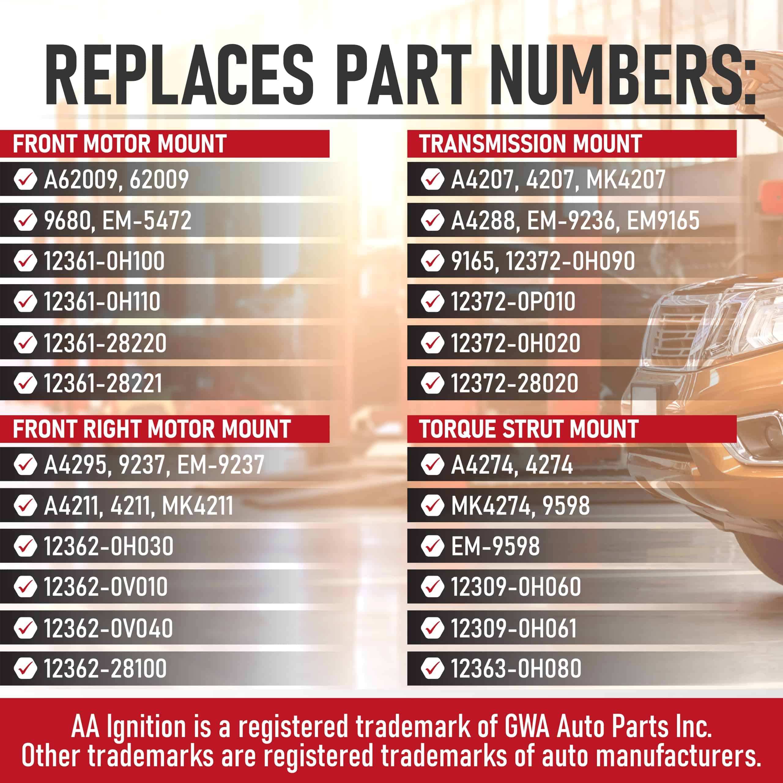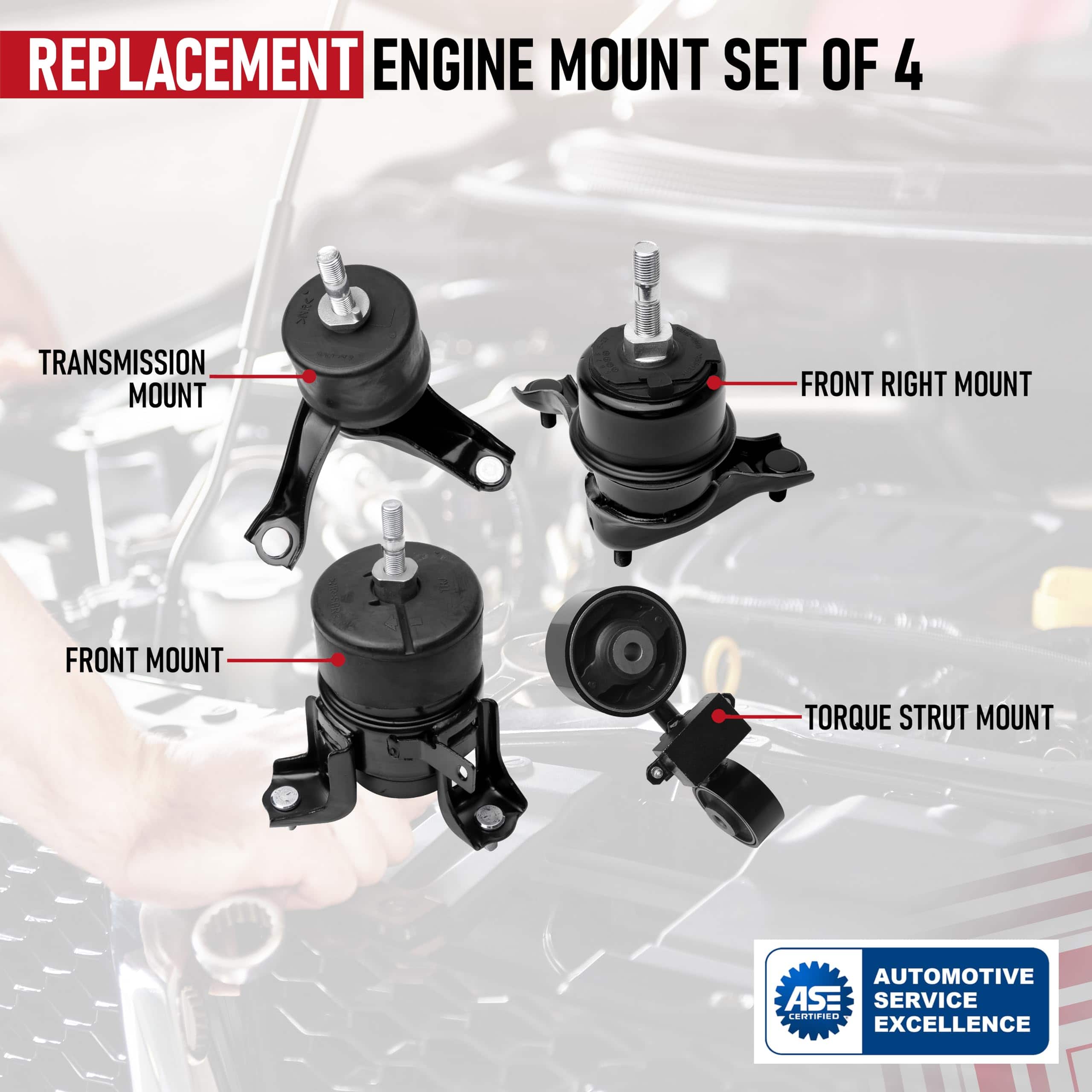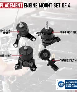 Conjunto de 4 montajes de motor y transmisión de reemplazo compatibles con Toyota Camry – 2007, 2008, 2009, 2010, 2011 2.4L. Si escucha golpes, otros ruidos inusuales o siente que el motor está rebotando durante las paradas, es probable que los montajes del motor y la transmisión sean los culpables. La aceleración repentina o incluso giros cerrados también pueden indicar un problema con estas piezas. Este juego reemplaza los números de parte A4274, 4274, 12309-0H060, 12309-0H061, 12363-0H080, A4207, 4207, 12372-0H090, 12372-0P010, 12372-0H020, 12372-28020, A4211, 4211, 12362-0H030, 12362-0V010, 12362-0H030, 12362-0V040, 12362-28100, A62009, 62009, 12361-0H100, 12361-0H110, 12361-28220, 12361-28221 comúnmente encontrados en el popular Camry con el motor de 2.4 litros incluyendo los años de modelo 07, 08, 09, 10, 11. Aunque no son piezas OEM genuinas, este conjunto de 4 montajes de motor y transmisión son reemplazos directos para los montajes de fábrica en su vehículo Camry. Ajustarán, funcionarán y se verán como los montajes de motor y transmisión de fábrica. Este kit de montaje de motor y transmisión viene completo con garantía. Si la pieza falla en su vehículo, simplemente contáctenos para un reemplazo gratuito. Ahorre tiempo y dinero comprando esta pieza e instalándola usted mismo.