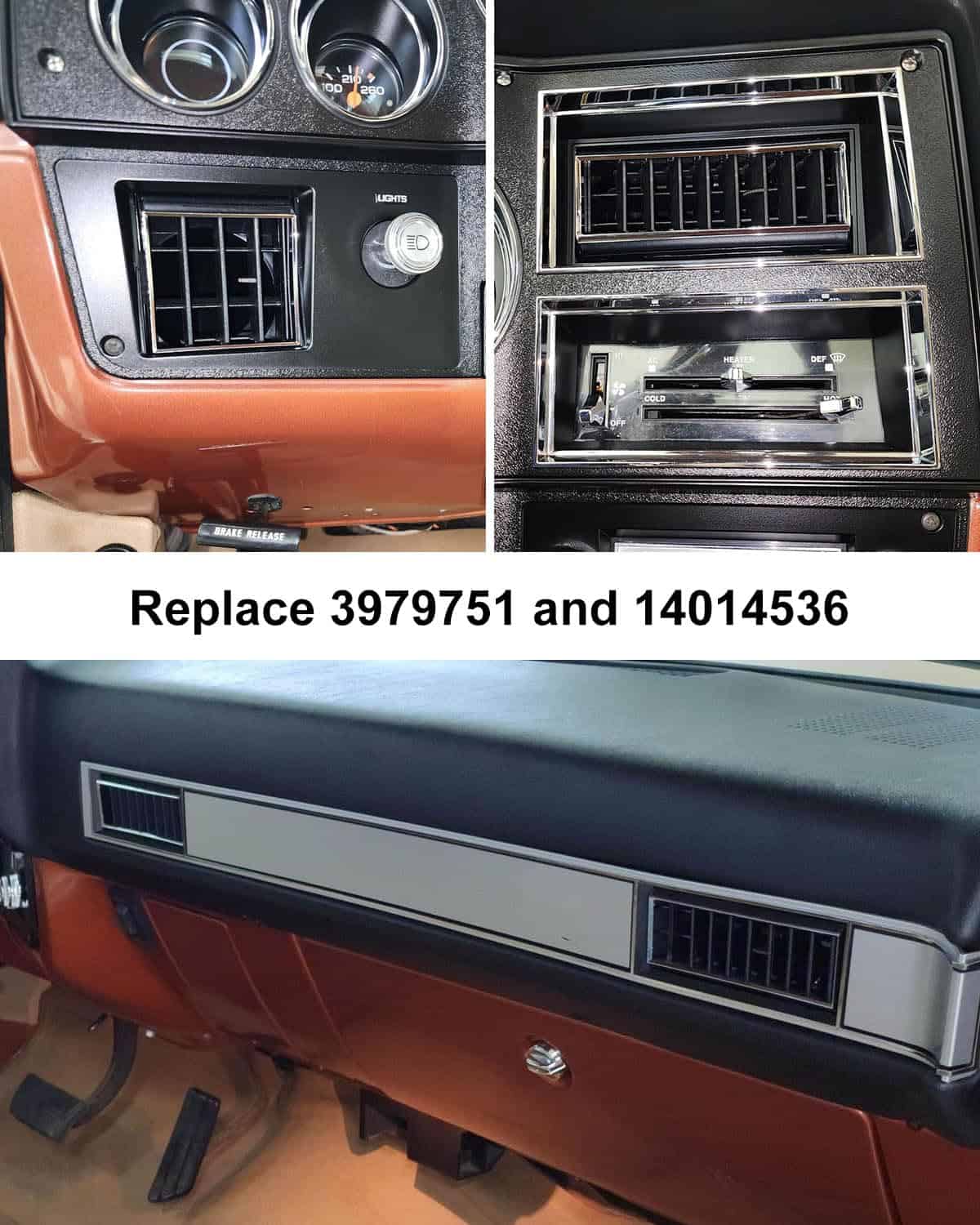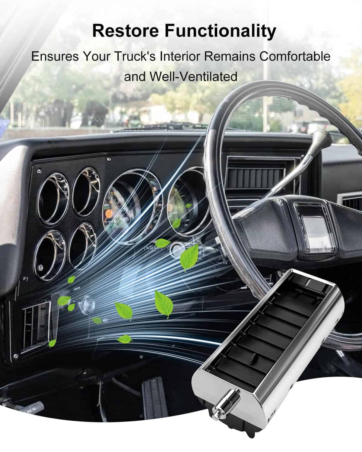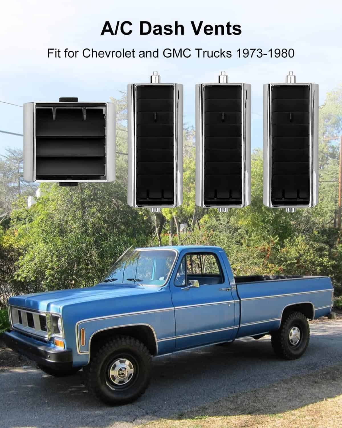 Juego de rejillas de aire acondicionado para tablero HZSIFU compatible con camionetas Chevy y GMC 1973-1980. Reemplaza las partes 3979751 y 14014536. Fabricadas con materiales de alta calidad para resistir el envejecimiento y el desgate, ofreciendo una solución duradera para el sistema de aire acondicionado de su vehículo. Restaura eficientemente las funciones de las rejillas de aire, asegurando que el interior de su camioneta permanezca cómodo y bien ventilado. Las rejillas de aire acondicionado HZSIFU reviven la comodidad original de su clásico.