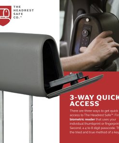 El Reposacabezas Seguro tiene un diseño universal que le permite adaptarse a todos los vehículos. Hay tres formas de obtener acceso rápido al Reposacabezas Seguro: primero, un lector biométrico que usa su huella dactilar; segundo, un código de 4 a 8 dígitos; tercero, el método tradicional de una llave. Tire hacia abajo de la costura invisible para revelar la cerradura. ¡No hay forma de que nadie pueda saber que está allí! Y aunque lo hicieran, ¡no hay forma de que puedan abrirlo sin usar uno de los tres métodos para desbloquearlo! Solo usamos los mejores materiales: cubiertas de grado automotriz, caja fuerte de acero calibre 18, puerta de acero calibre 16 y una cerradura de acero. Nuestros productos son fáciles de instalar y una vez instalados, su Reposacabezas Seguro se bloquea en su lugar para que solo usted pueda quitarlo. Dormirá tranquilo sabiendo que sus pertenencias están seguras.