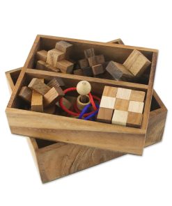 Este set de seis mini rompecabezas del artesano tailandés Waraporn Khamsuk te mantendrá entretenido sin fin. El set incluye los siguientes rompecabezas: el Cubo de la Serpiente, el rompecabezas Burr, el Pilar Gordiano, el rompecabezas Estrella Fugaz, el X-Factor y el Ladrillo Bloqueado. Hechos a mano de madera de Raintree, cada rompecabezas es único y desafiante. Pon a prueba tu concentración e imaginación para resolver estos rompecabezas desafiantes para el cerebro.