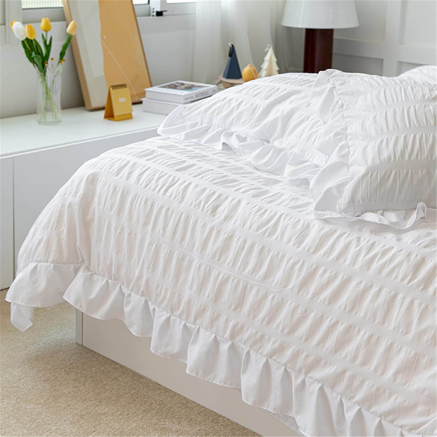 La ropa de cama con volantes de seersucker marca la diferencia y cambia la apariencia de tu habitación, habitación de niñas, habitación de invitados, habitación de hotel. También es una idea de regalo perfecta para tu mamá, hermana, esposa, hija y todas las demás personas queridas con muchos diseños sorprendentes. Paquete incluido: (Inserto no incluido) Juego de Cubierta de Edredón Tamaño Queen: 1 x Cubierta de Edredón: 228 X 228cm/90″ X 90″ 2 x Fundas de Almohada: 51x66cm/20″ X 26″ Detalles de la Cubierta de Edredón Material: 100% Microfibra Cepillada Suave Las Fundas de Almohada tienen un Cierre de Envoltura. Características: Este conjunto de ropa de cama con volantes crea un look elegante para vivir relajado y moderno en tu dormitorio. Diseño Seersucker: El diseño de seersucker y la tela suave te mantienen cómodo durante toda la noche. Diseño de Cuidado: La cubierta de edredón queen con rayas texturizadas tiene un cierre de cremallera, conveniente para poner y quitar tu edredón, 4 lazos en las esquinas interiores para mantener tu edredón en su lugar sin amontonarse. Método de Lavado: Lavar a máquina en agua fría con colores similares. Secar a baja temperatura. No usar lejía. No planchar.