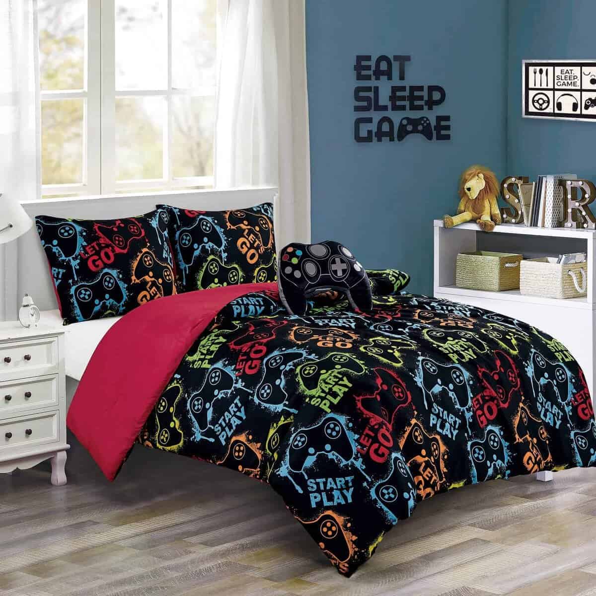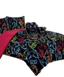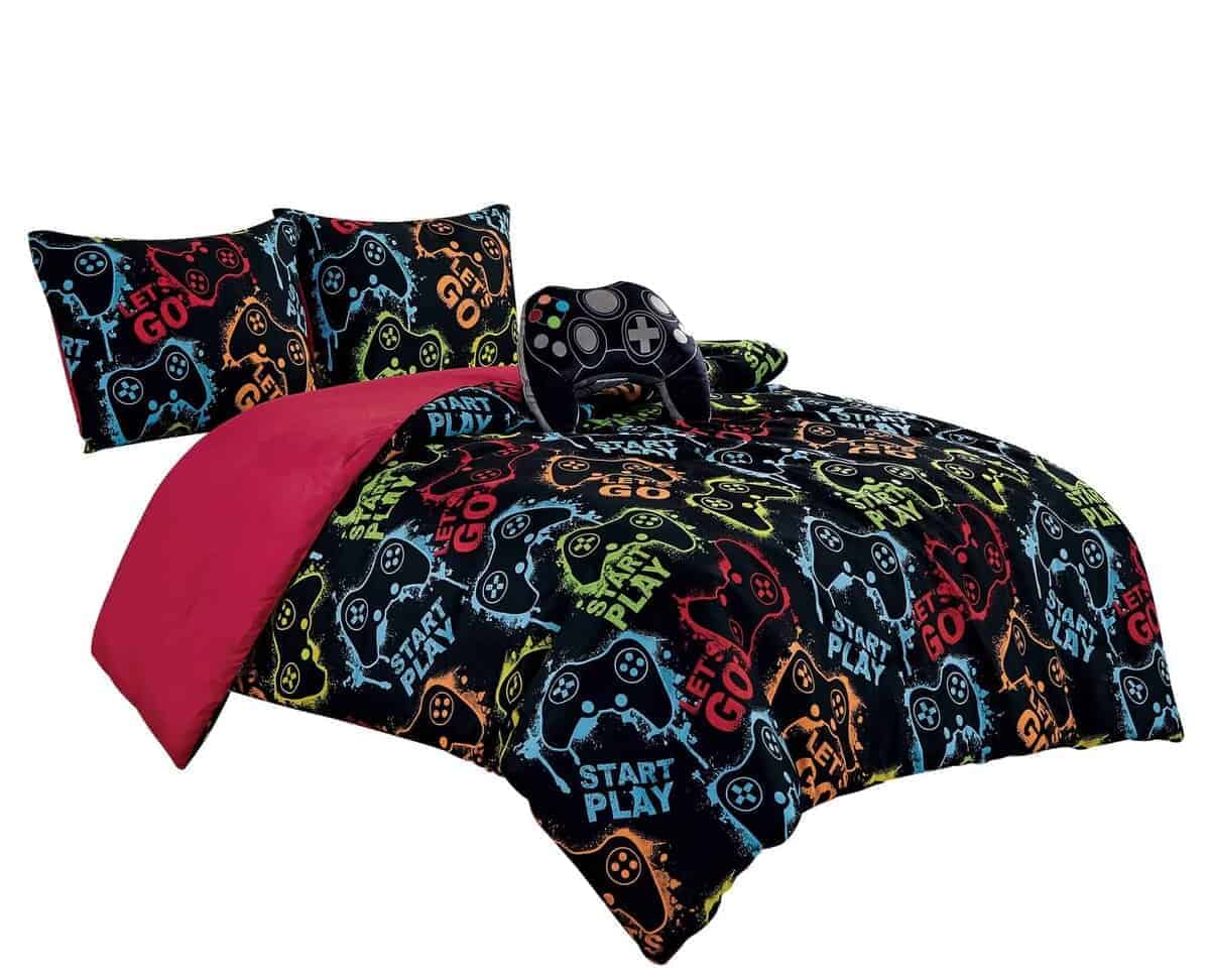 La ropa de cama Chezmoi Collection Gamer de 4 piezas es perfecta para los amantes de los videojuegos. Este set incluye un edredón, dos fundas de almohada y una almohada de juego con diseño de gamepad. Con medidas de tamaño completo/queen, el edredón mide 86″ x 86″ y las fundas de almohada miden 20″ x 26″.