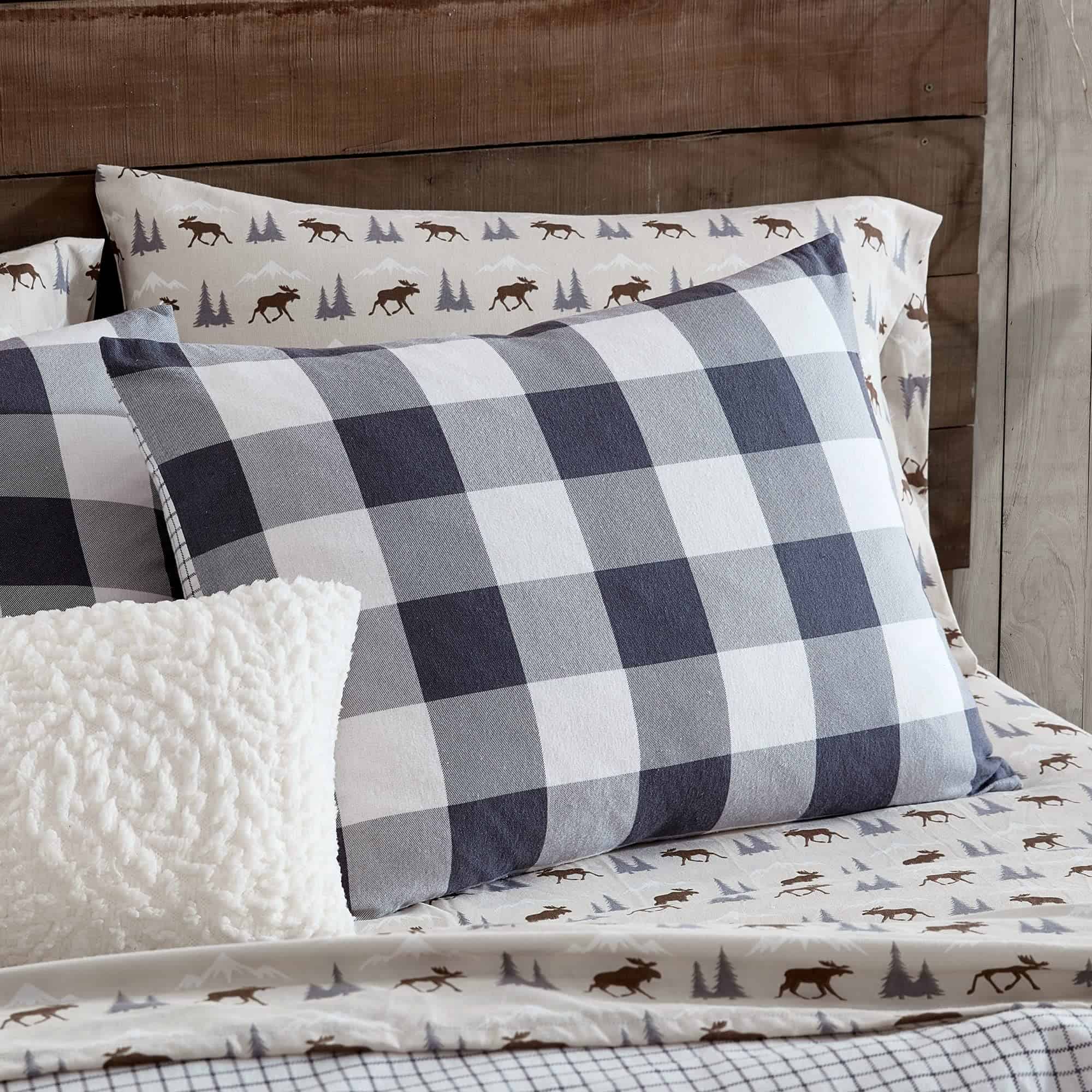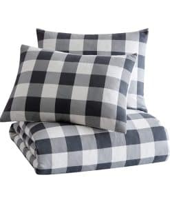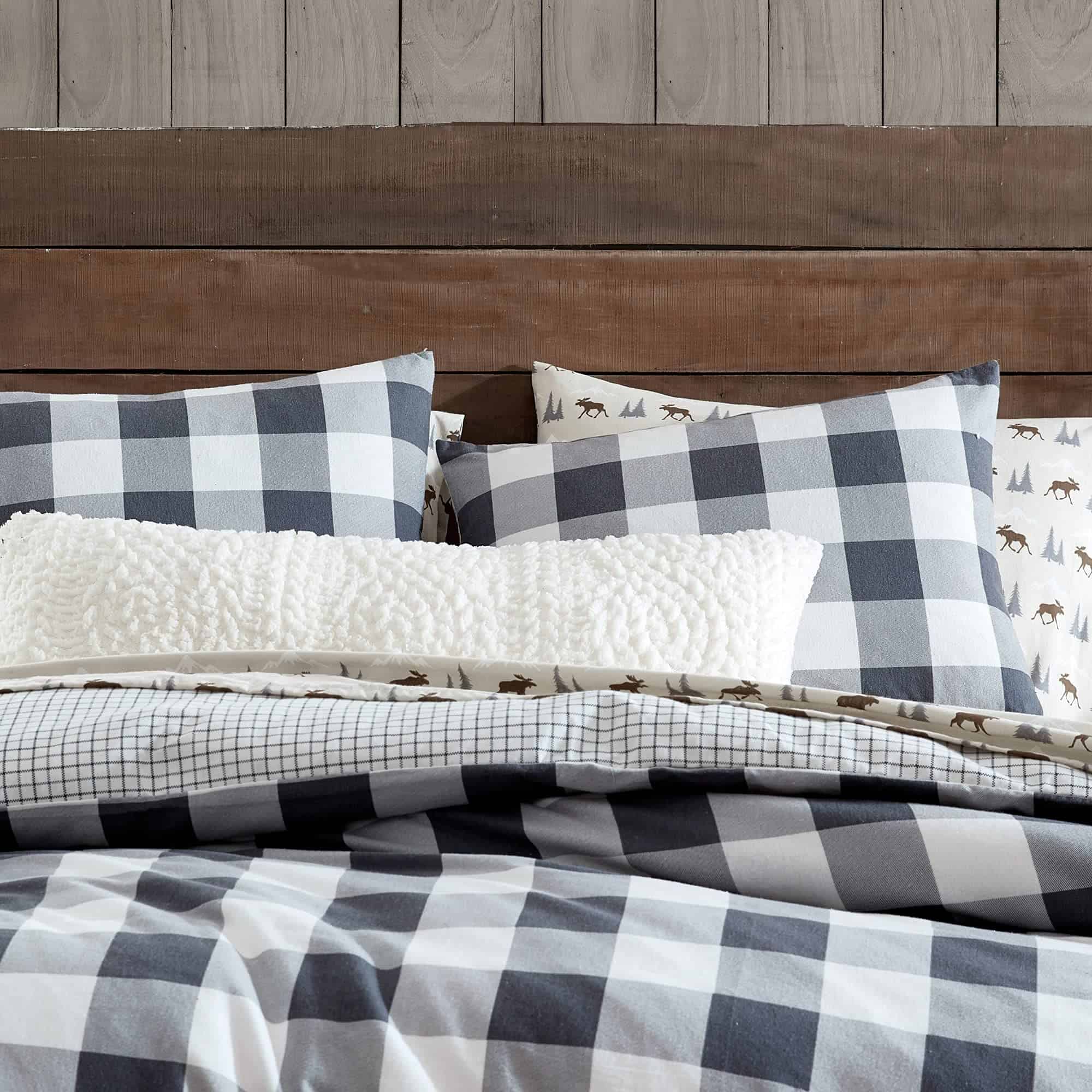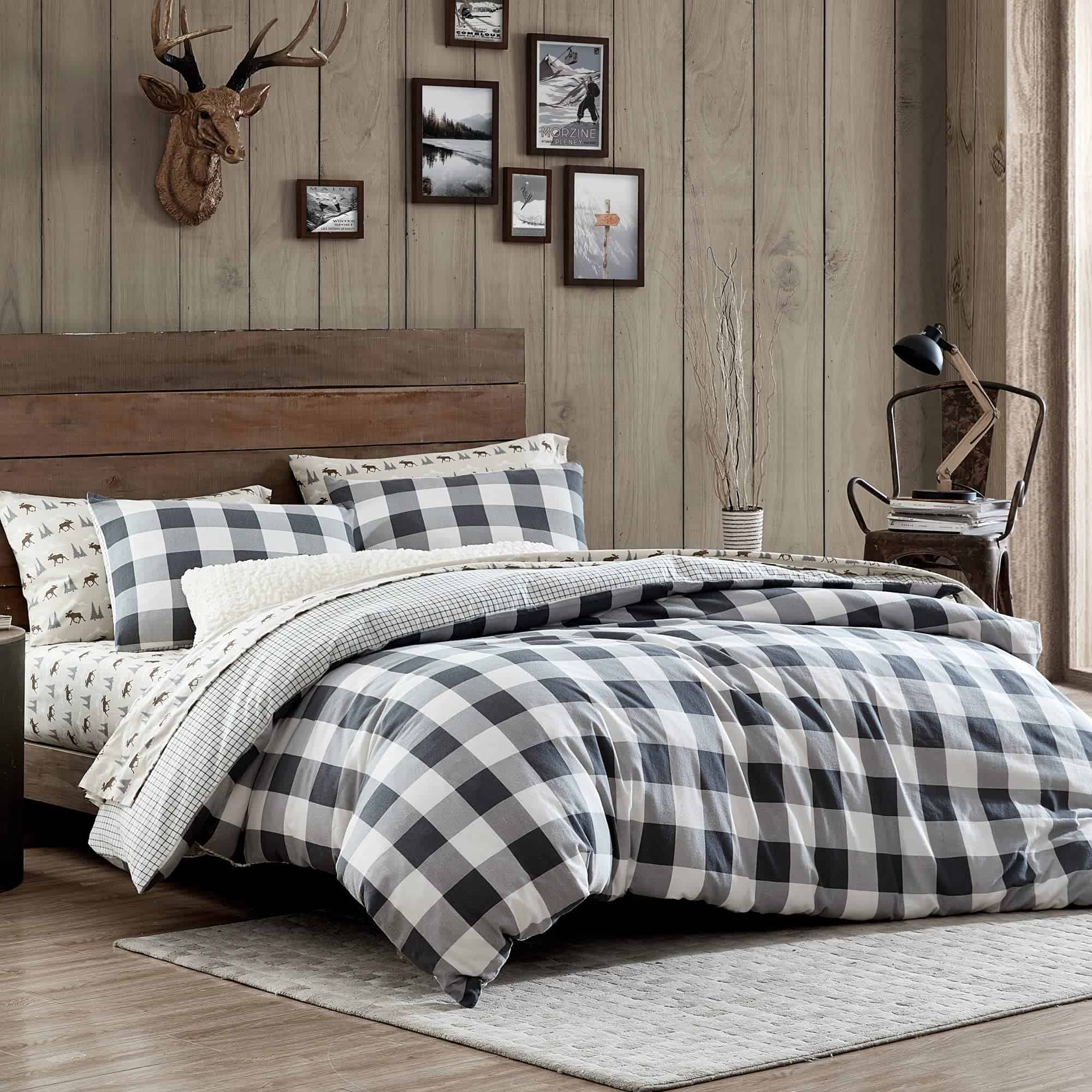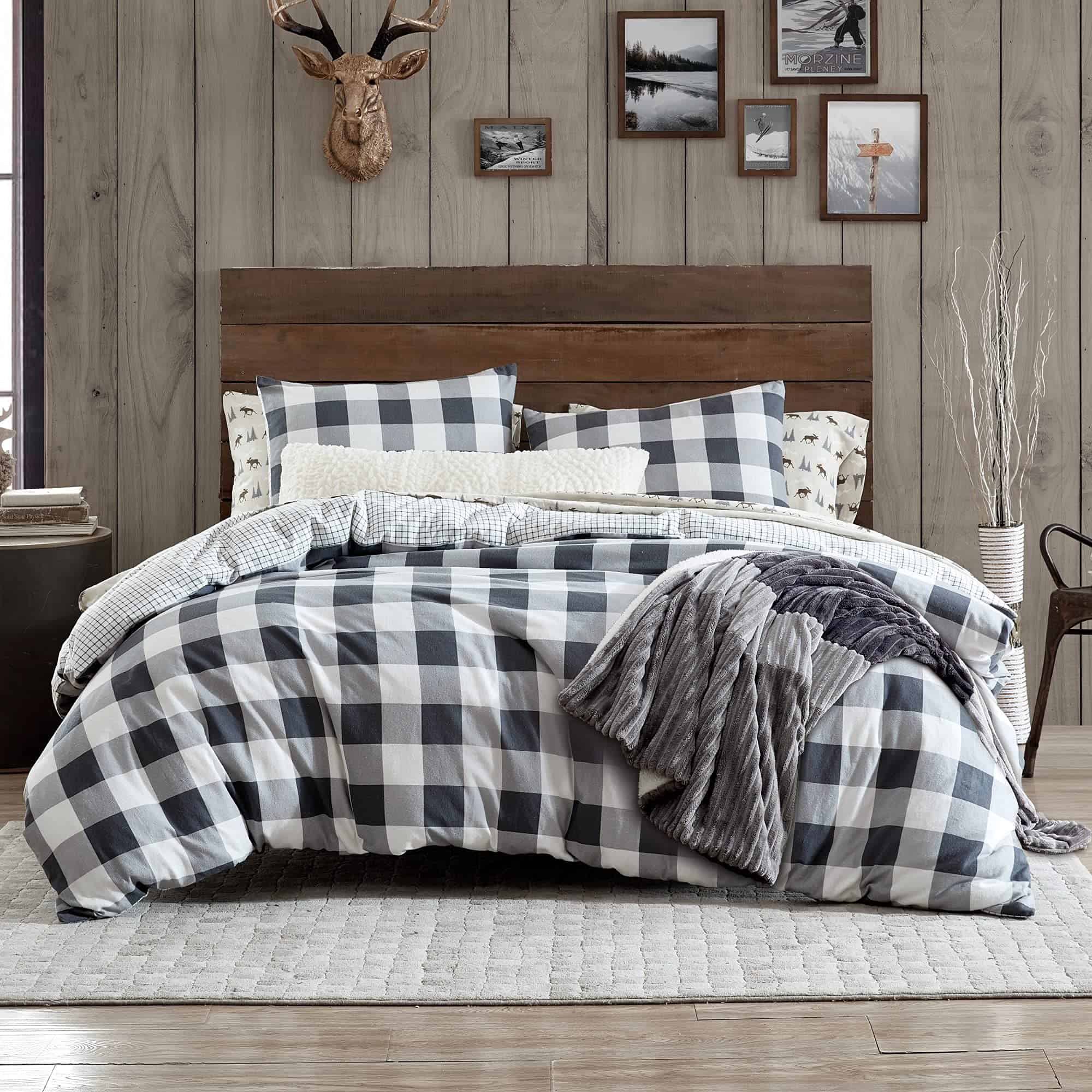 Incluso los leñadores y leñadoras tienen un lugar especial para la ropa de cama acogedora. El juego de ropa de cama Buffalo Check al aire libre de Bass está inspirado en la herencia y el amor por el vichy. Este patrón clásico le da a tu rincón de dormir un toque de nostalgia y frescura. El diseño de cuadros de vichy es impreso en la cara en gris, lo que lo hace versátil para combinar con otros accesorios para la ropa de cama. El reverso ofrece contraste con un patrón más pequeño de cuadros buffalo. Este look relajado y vivido viene con el toque más suave de la franela de algodón. Calienta tu dormitorio de estilo de cabaña con este juego de edredón o juego de sábanas.