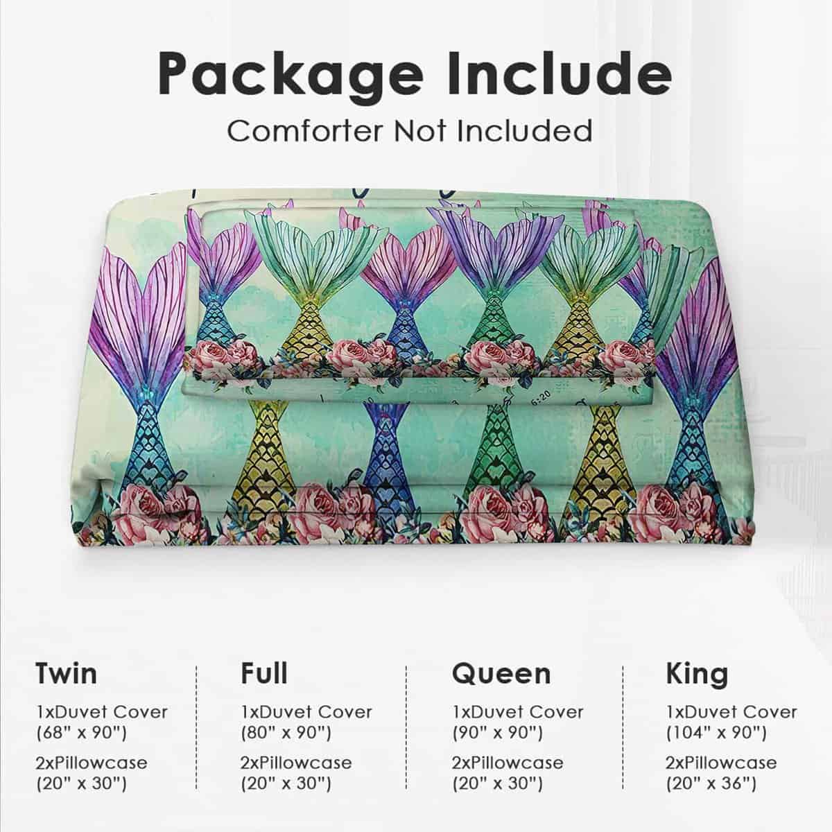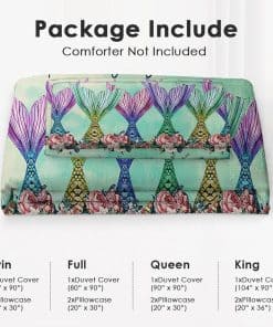 Tamaño queen: 1 funda de edredón (90″ x 90″) y 2 fundas de almohada (20″ x 30″). No hay edredón en el conjunto.