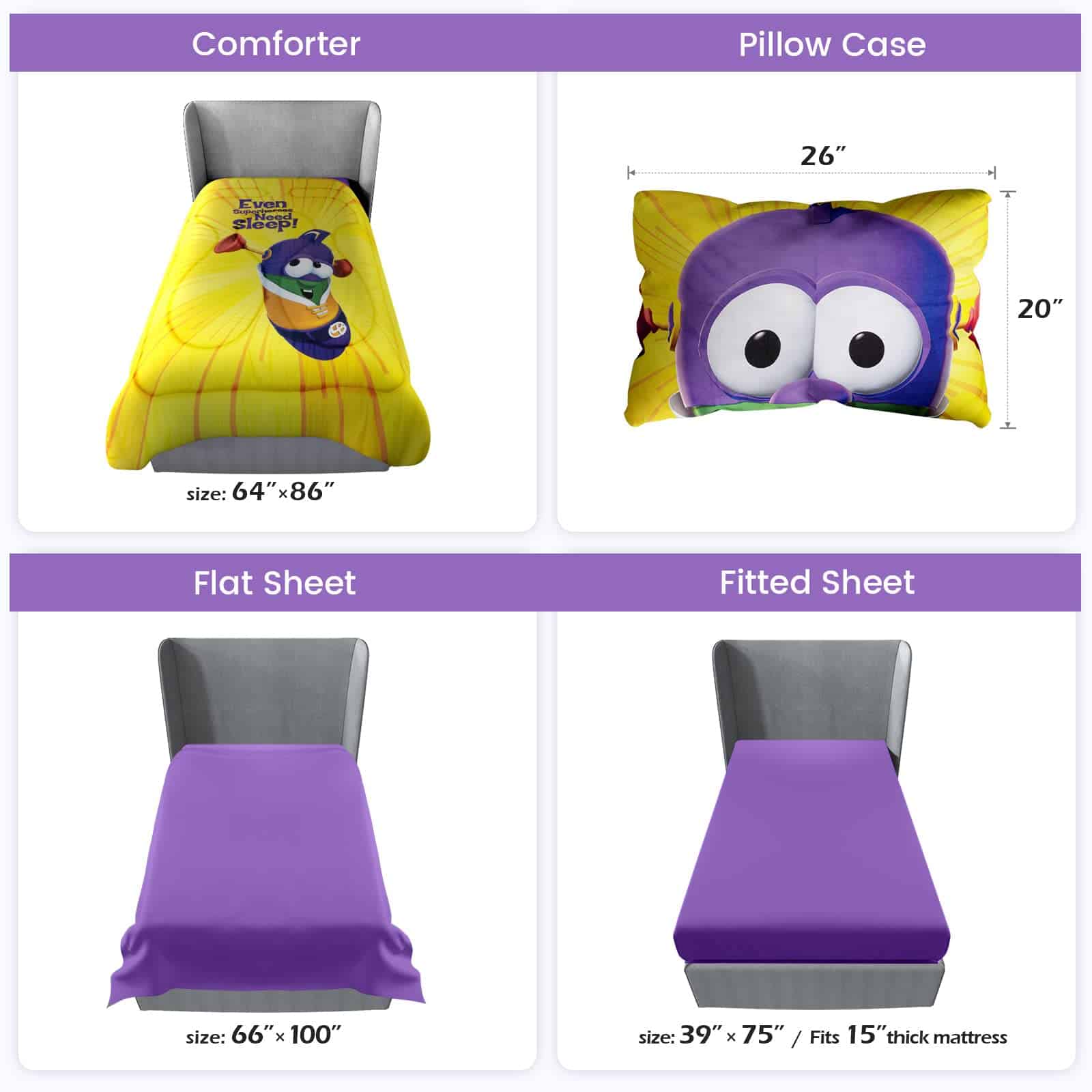 2. Tamaño – Este juego de edredón gemelo incluye los siguientes cuatro componentes: 1 edredón (64 x 86 pulgadas), 1 sábana plana (66 x 100 pulgadas), 1 sábana ajustable (39 x 75 + 15 pulgadas) y 1 funda de almohada (20 x 26 pulgadas).