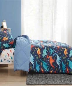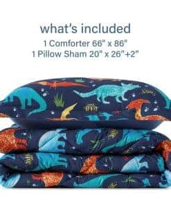 Juego de Ropa de Cama para Niños de Dinosaurios Gemelos para Niños, 2 Piezas de Juegos de Comforter de Dinosaurios para Niños Gemelos, Súper Suave Ligero para Todas las Estaciones, Incluye 1 Comforter (66″x86″) y 1 Funda de Almohada (20″x26″+2″) Este juego de ropa de cama tamaño gemelo incluye 1 Comforter (66″x86″) y 1 Funda de Almohada (20″x26″+2″); el juego de ropa de cama tamaño queen incluye 1 Comforter (88″x88″) y 2 Fundas de Almohada (20″x26″+2″). Este juego de comforter para niños impreso está fabricado en microfibra y relleno con 200 gramos de relleno premium, es transpirable y cálido, como dormir en una nube. Ligero y adecuado para todo el año. Este juego de ropa de cama para niños adopta la linda imagen de dinosaurios, que es vívida y divertida. Deje que sus hijos sientan que están en un paraíso de dinosaurios, acompáñelos a pasar una noche maravillosa. Nuestro juego de comforter para niños es resistente a la decoloración y a las arrugas y se puede lavar a máquina. Para limpiar, lavar a mano o a máquina en frío en un ciclo suave. Para secar, secar al aire o secar en secadora a baja temperatura. No usar lejía. El estilo adorable mantendrá a los niños cómodos, y también puede inspirar el deseo de explorar de los niños y desarrollar su imaginación y creatividad. Deje que su hijo vuele libremente en el mundo de los dinosaurios y comience una maravillosa aventura