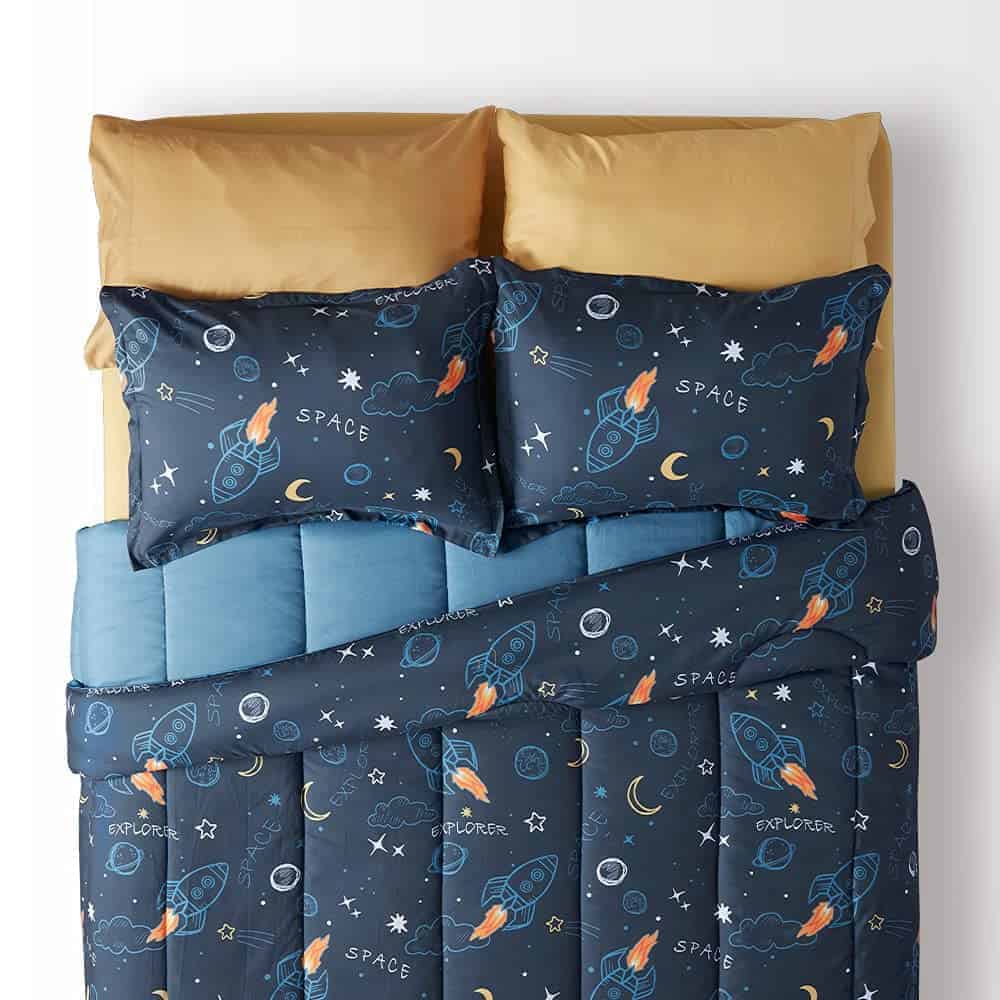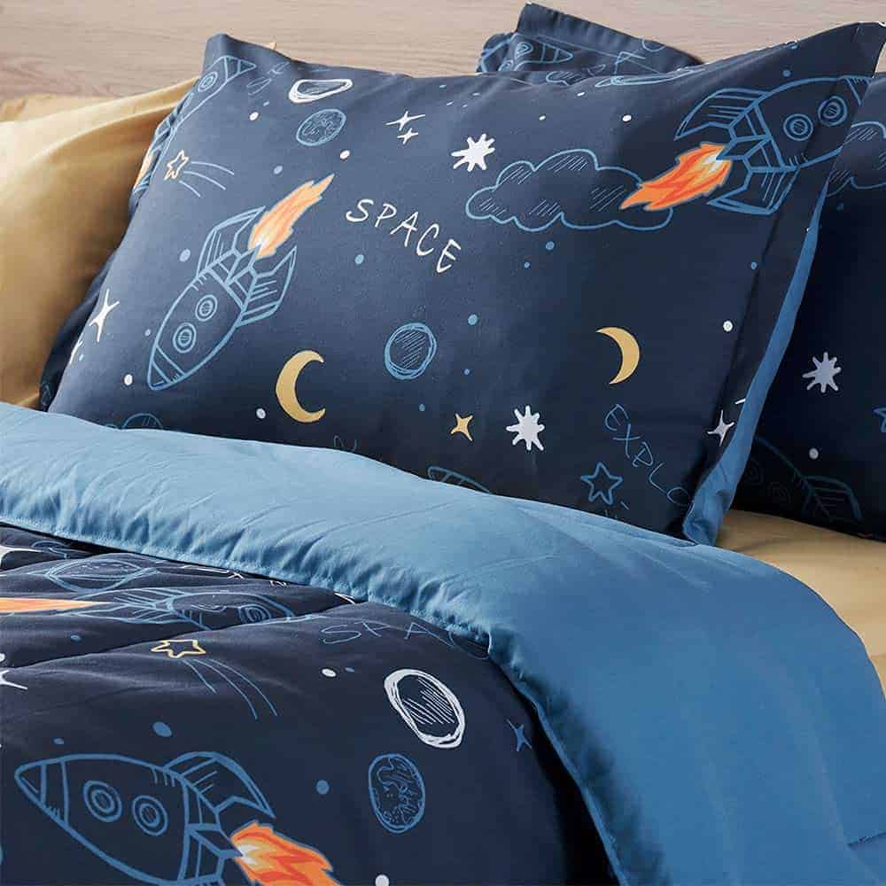 El juego de ropa de cama SLEEP ZONE para niños en tamaño Twin es perfecto para que tu pequeño explorador disfrute de dulces sueños en un mundo de cohete espacial. El diseño adorable con elementos del espacio como estrellas, lunas y cohetes en colores vibrantes hará que tu niño se enamore de su ropa de cama. El edredón está hecho de microfibra cepillada gruesa que es ultra suave y cómoda, ideal para un descanso tranquilo. Con un relleno de fibra de 200 g/m² mezclada con fibra INVISTA de enfriamiento, el edredón es transpirable, ligero y no genera olores. La durabilidad está garantizada gracias al diseño clásico de acolchado y la costura precisa que evita que los rellenos se apelmacen, incluso después de múltiples lavados. El juego de ropa de cama incluye un edredón de 66×90 pulgadas, una sábana ajustable de 38x74x14 pulgadas, una sábana plana de 66×96 pulgadas, una almohada sham de 20×26 pulgadas y una funda de almohada de 20×30 pulgadas para una coordinación perfecta en la habitación de tu hijo. Además, la marca SLEEP ZONE tiene más de 40 años de experiencia en la fabricación de productos de ropa de cama de alta calidad y se enorgullece de proporcionar productos seguros y libres de químicos dañinos para toda la familia. Inspira a tu pequeño a soñar en grande con este juego de cama adorable y cómodo.