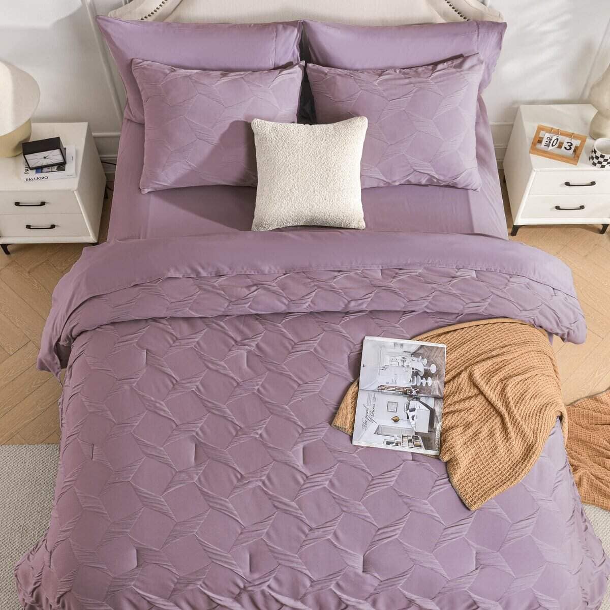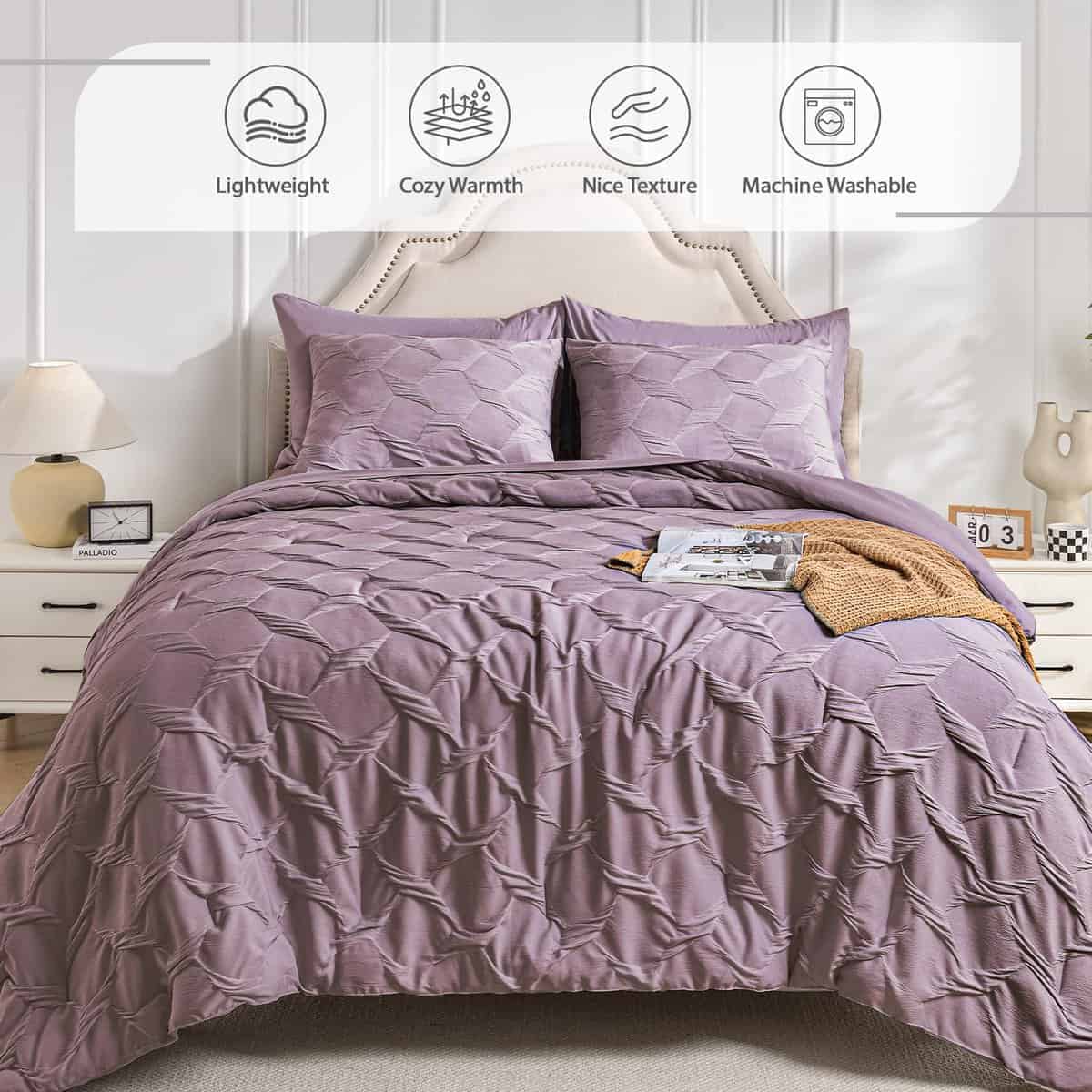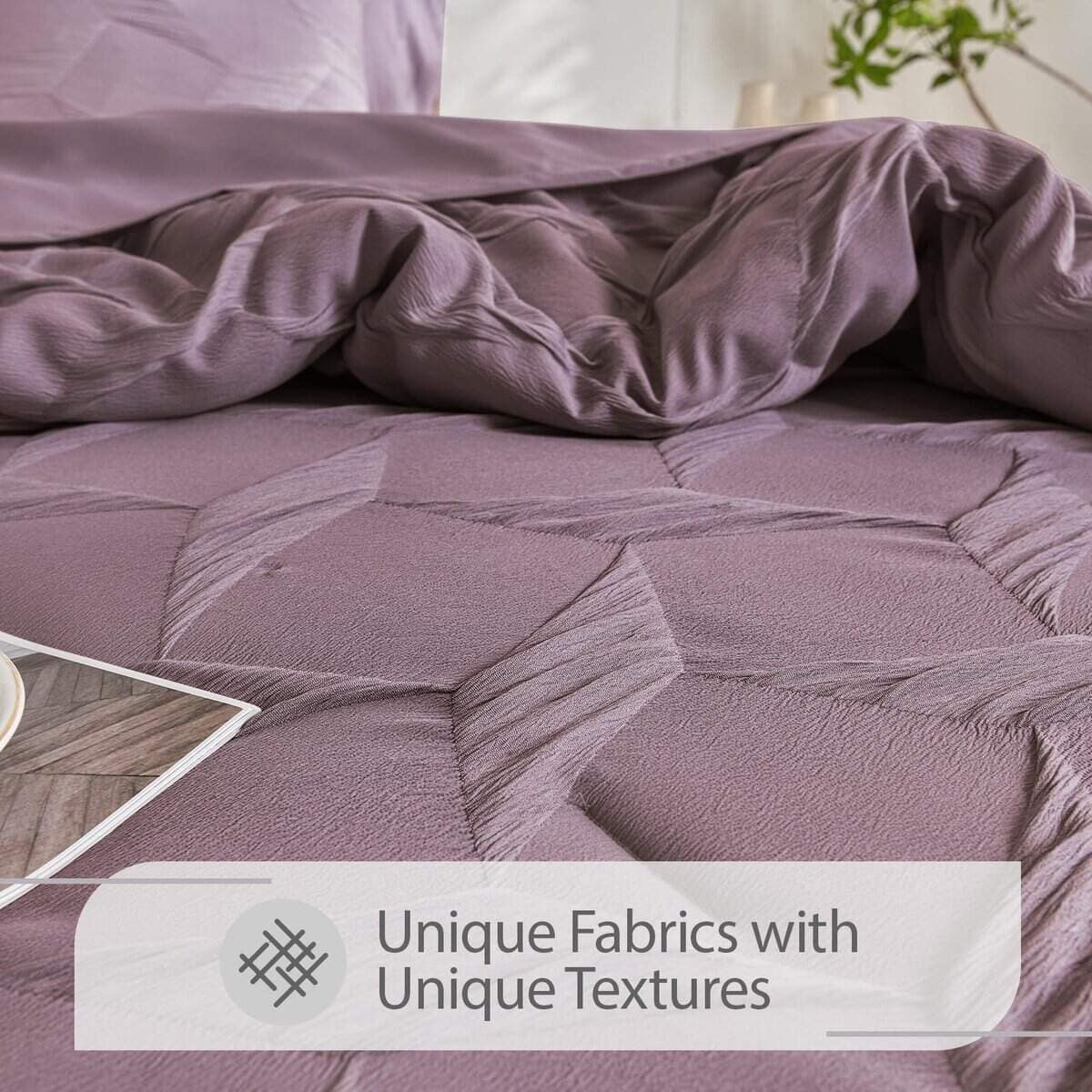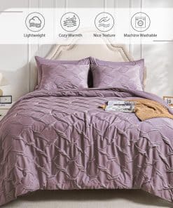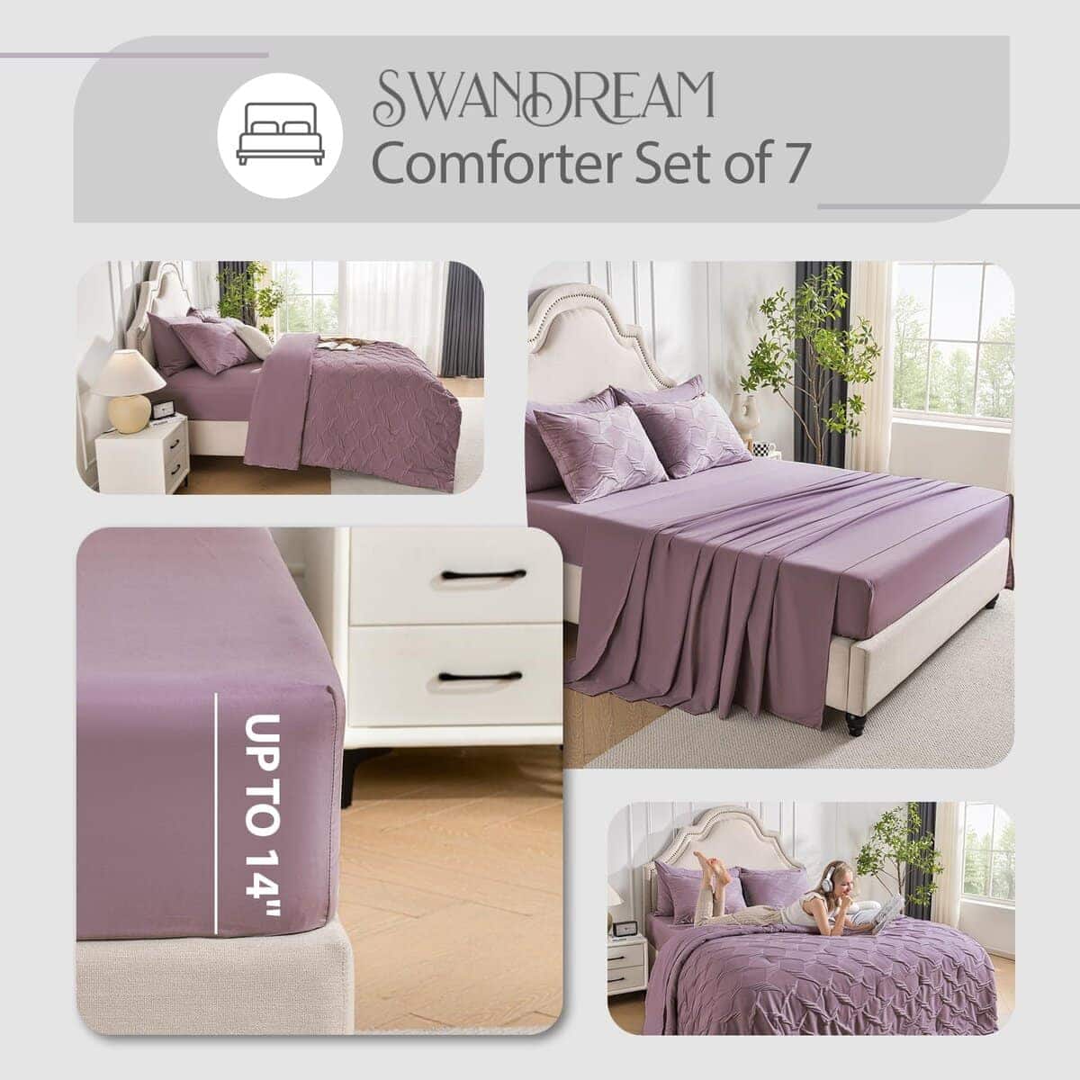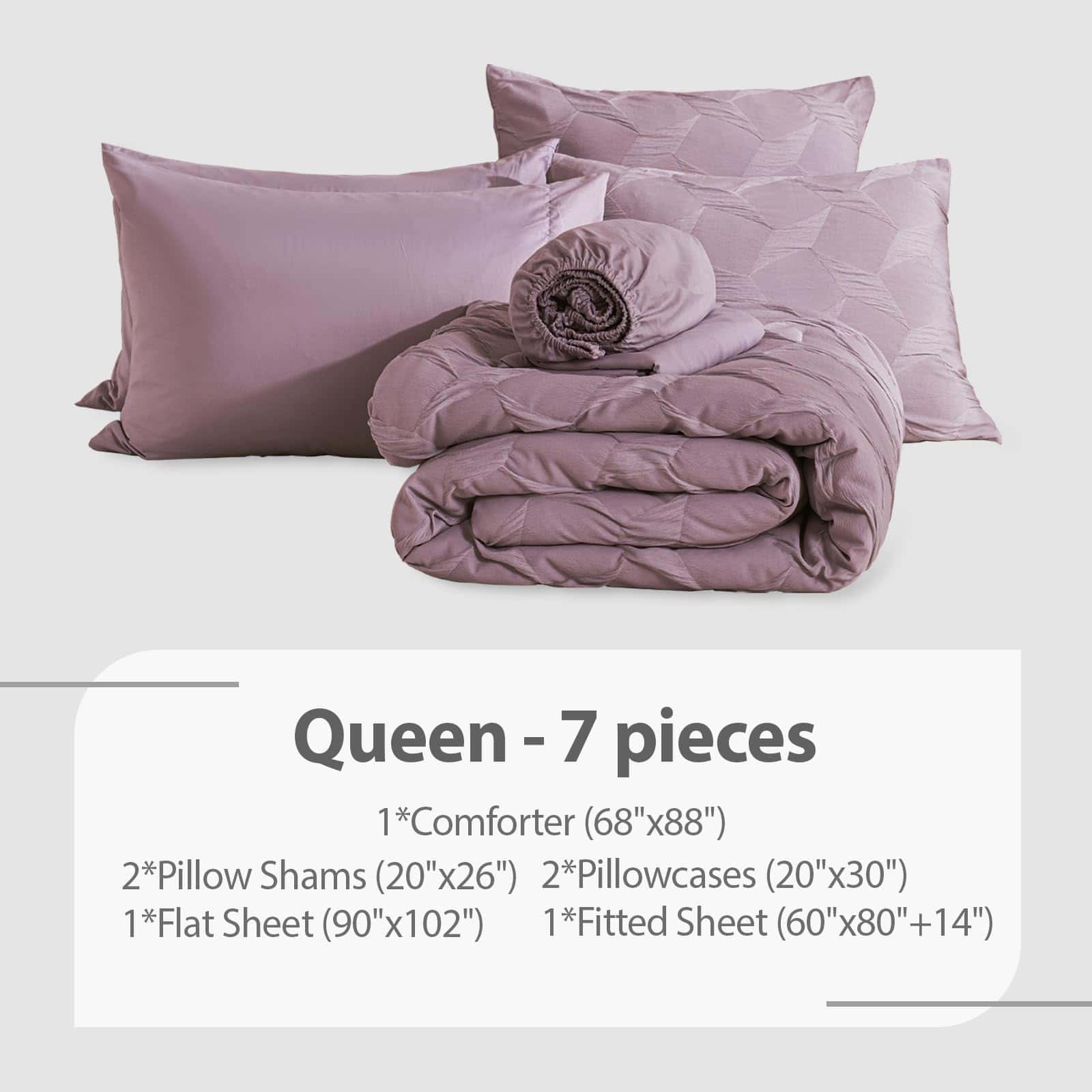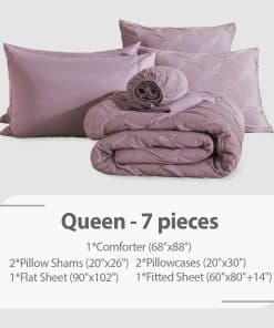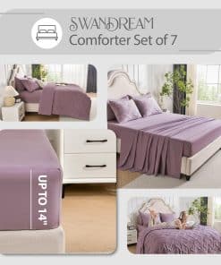 Juego de Ropa de Cama Queen Swandream – Juego de Confort de Lujo en Jacquard de Espandex de 7 Piezas, Colcha Ligera con 1 Sábana Ajustable, 1 Sábana Plana, 2 Fundas de Almohada y 2 Fundas de Cojín, Morado Rojo. Instrucciones de Cuidado: Para preservar la suavidad de la tela y prevenir el pelado o el enroscamiento, recomendamos lavar suavemente en agua fría. Para secar, ya sea al aire libre al sol o utilizando un ajuste de baja temperatura. El cuidado adecuado prolongará la vida de tu ropa de cama, proporcionando confort duradero. Garantía de Satisfacción: Ten en cuenta que el color del producto puede variar bajo diferentes condiciones de iluminación. Dado que está envasado al vacío, recomendamos dejarlo reposar durante 24 horas después de desempaquetarlo. Si es posible, déjalo al sol o mételo en la secadora de 1 a 2 horas para restaurar su esponjosidad. Tu satisfacción es nuestra prioridad, si tienes alguna pregunta o inquietud, no dudes en contactarnos.