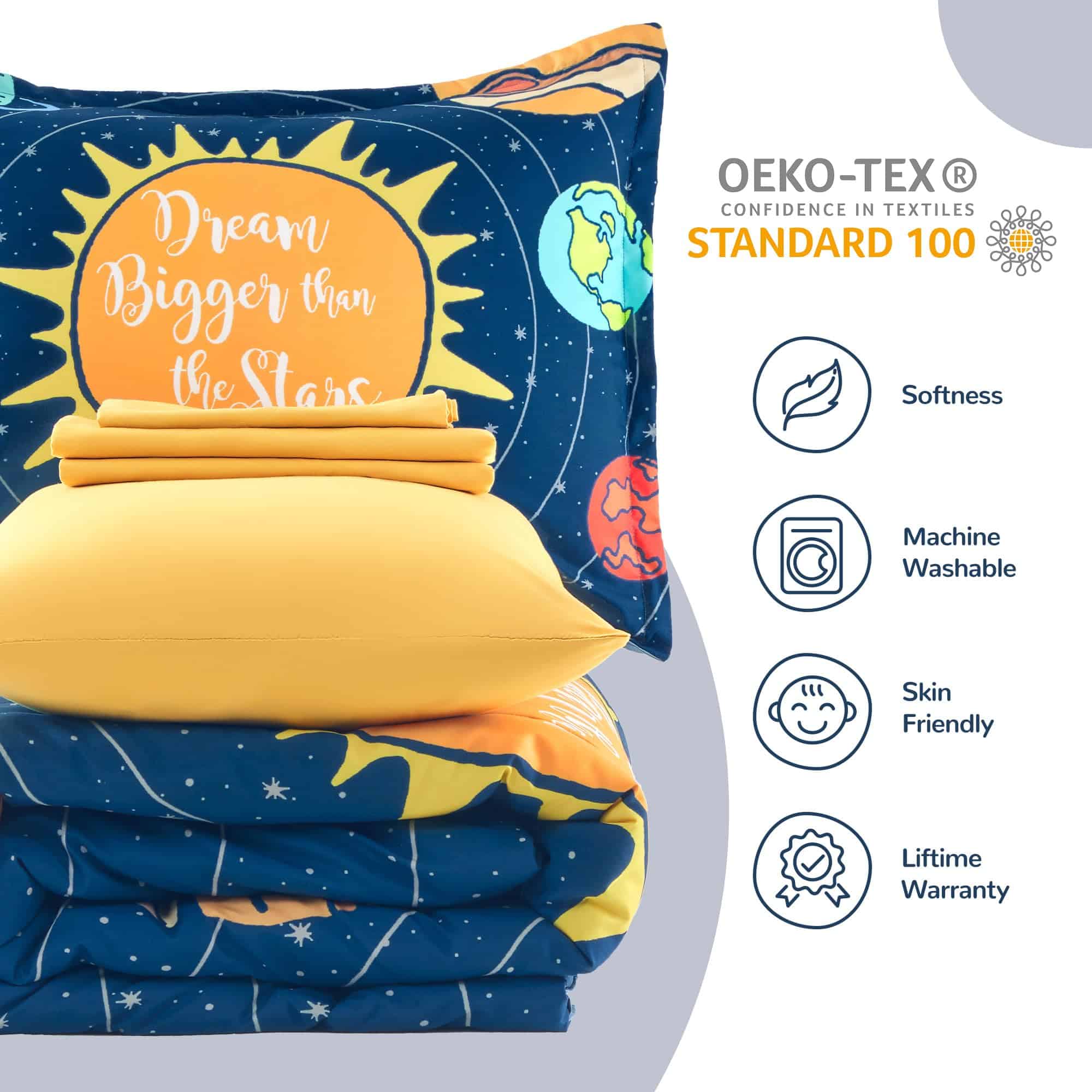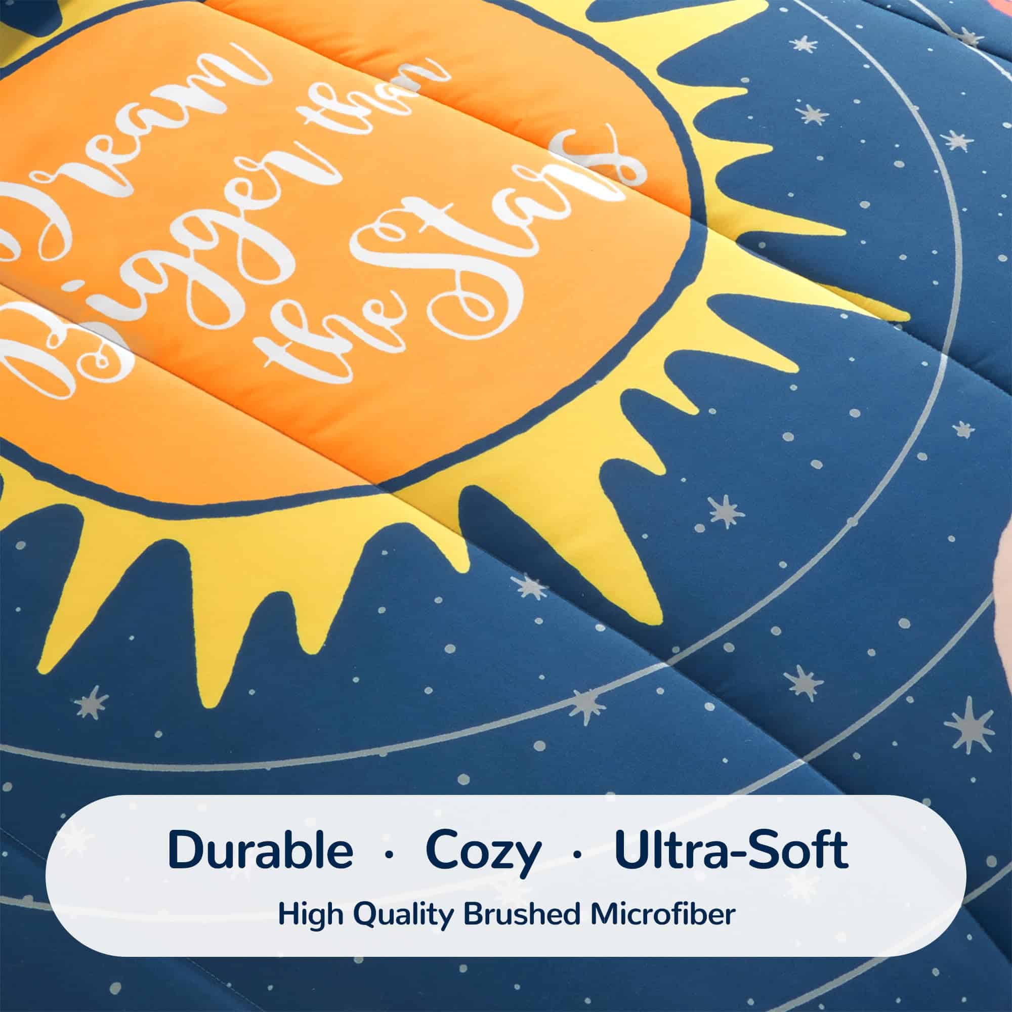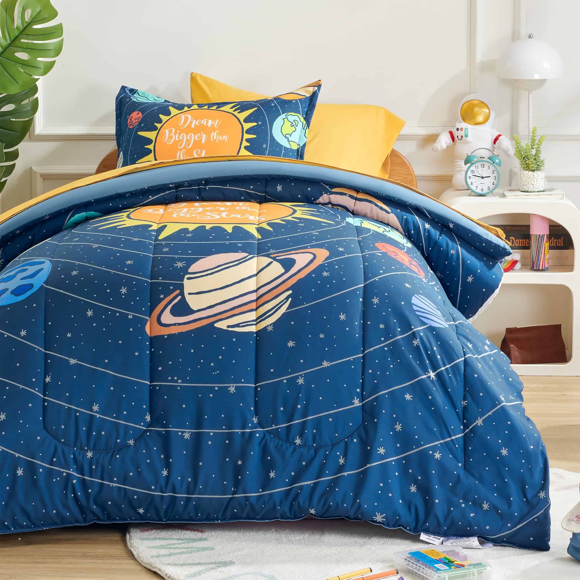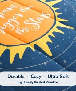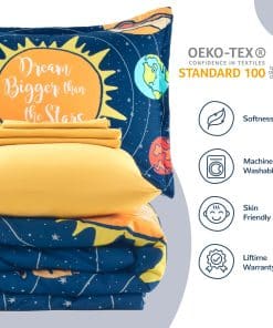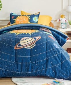 Añade un toque de diversión al dormitorio de tus hijos con este juego de ropa de cama SLEEP ZONE de 5 piezas. El conjunto incluye un edredón suave y ligero en un diseño del Sistema Solar, perfecto para que los niños se sientan cómodos durante todo el año. Este conjunto de cama duradero es fácil de cuidar, lo que lo hace ideal para el uso diario. ¡Haz que el dormitorio de tus hijos sea un espacio acogedor y divertido con este juego de ropa de cama SLEEP ZONE!