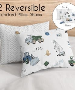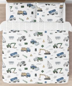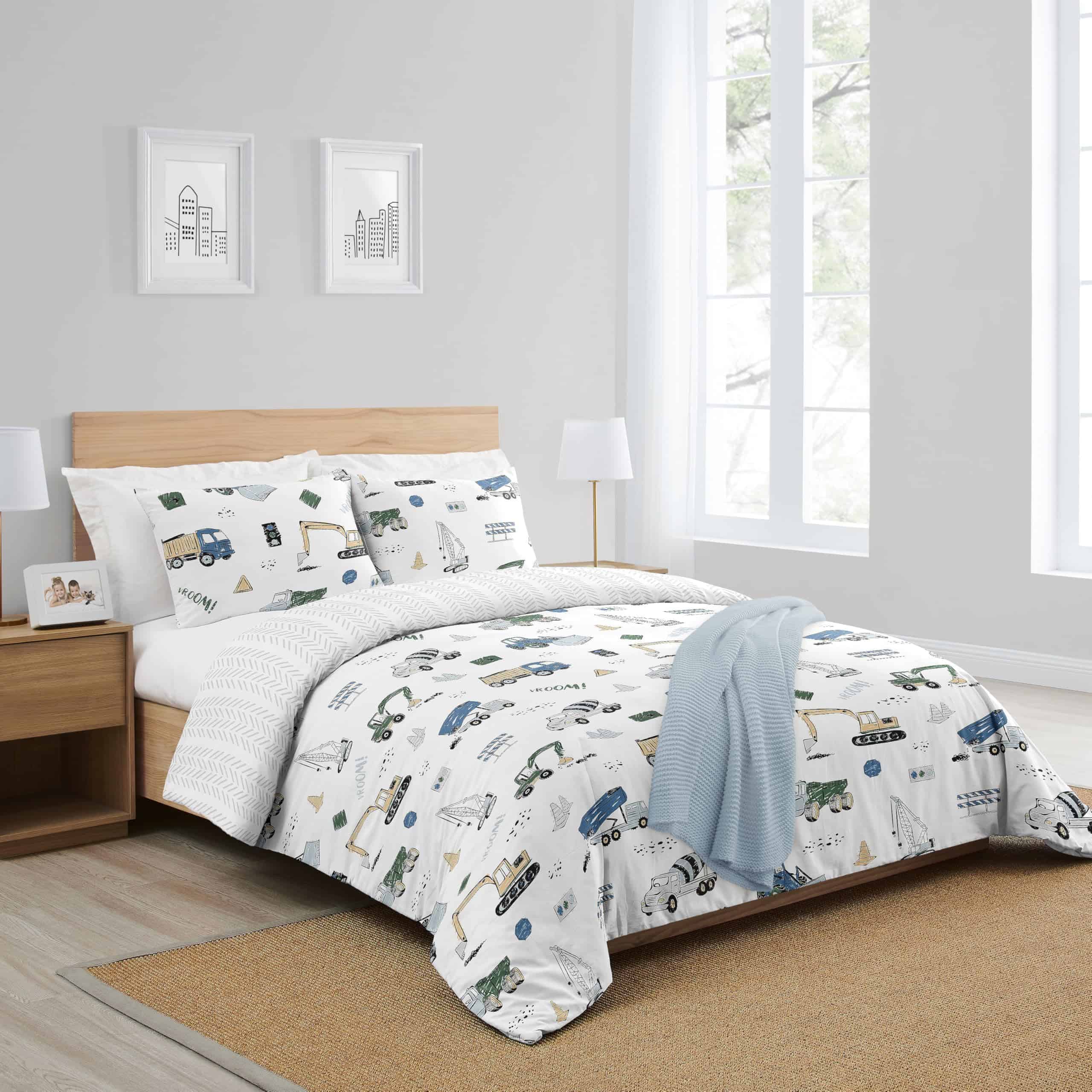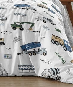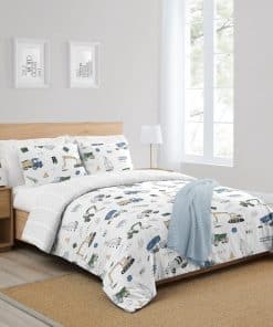 Este juego combina un divertido estampado de camiones inspirado en un libro para colorear con un estampado de neumáticos coordinado. Está hecho de tela de microfibra cepillada y es lavable a máquina. Secar a baja temperatura. Este diseño tiene accesorios a juego como tratamientos para ventanas, cestos de ropa, cortinas de baño y almohadas.