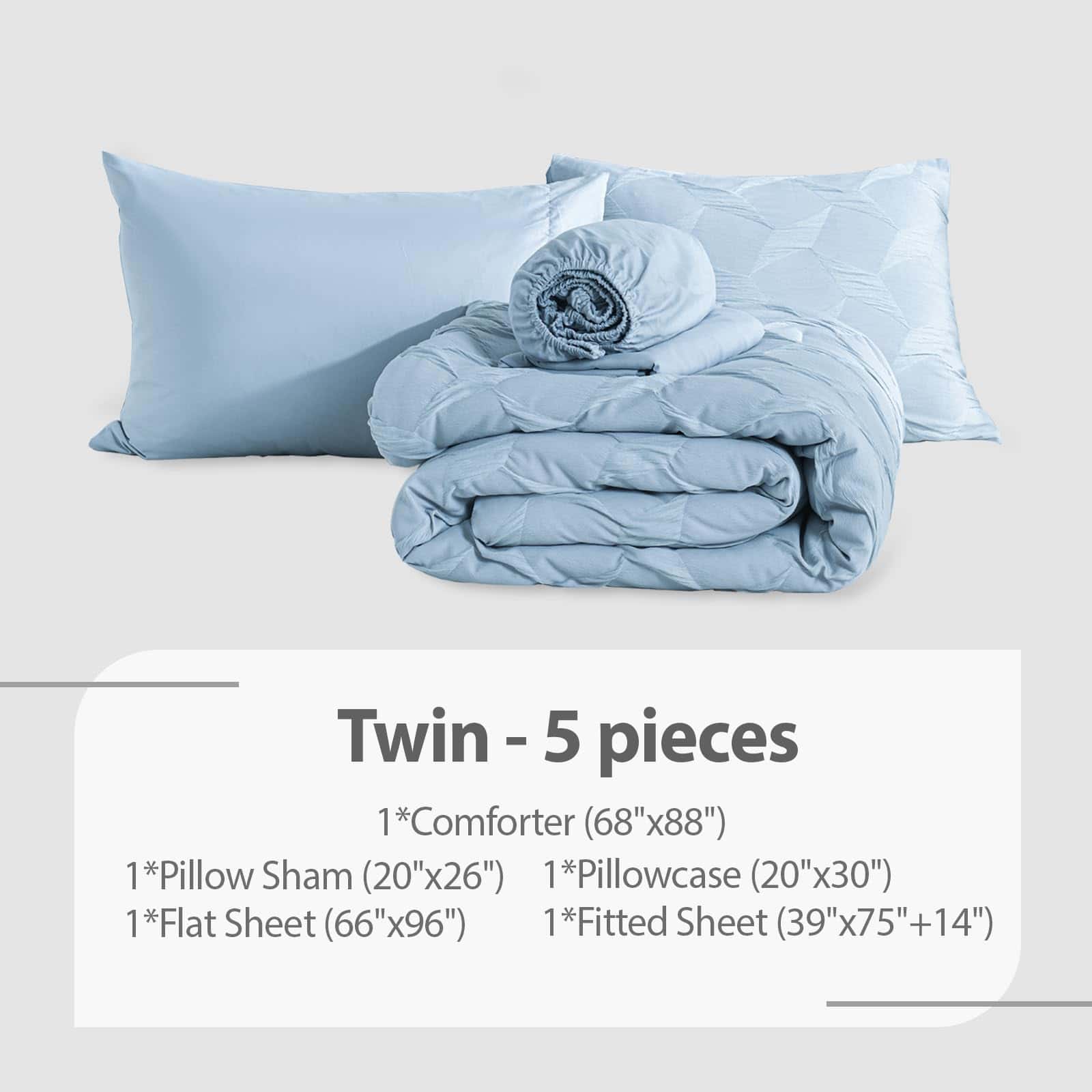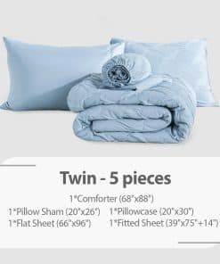 1. Juego de Cama: Juego de Cama Twin (5 Piezas) incluye 1 Edredón (68″x88″), 1 Sábana Plana (66″x96″), 1 Sábana Ajustable (39″x75″+14″), 1 Funda de Almohada (20″x30″) y 1 Funda para Almohada (20″x26″).