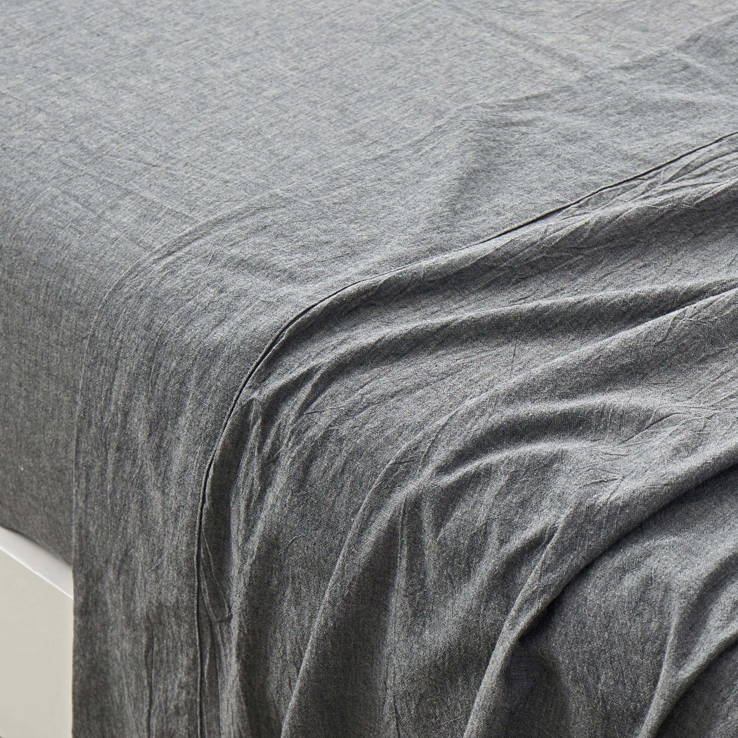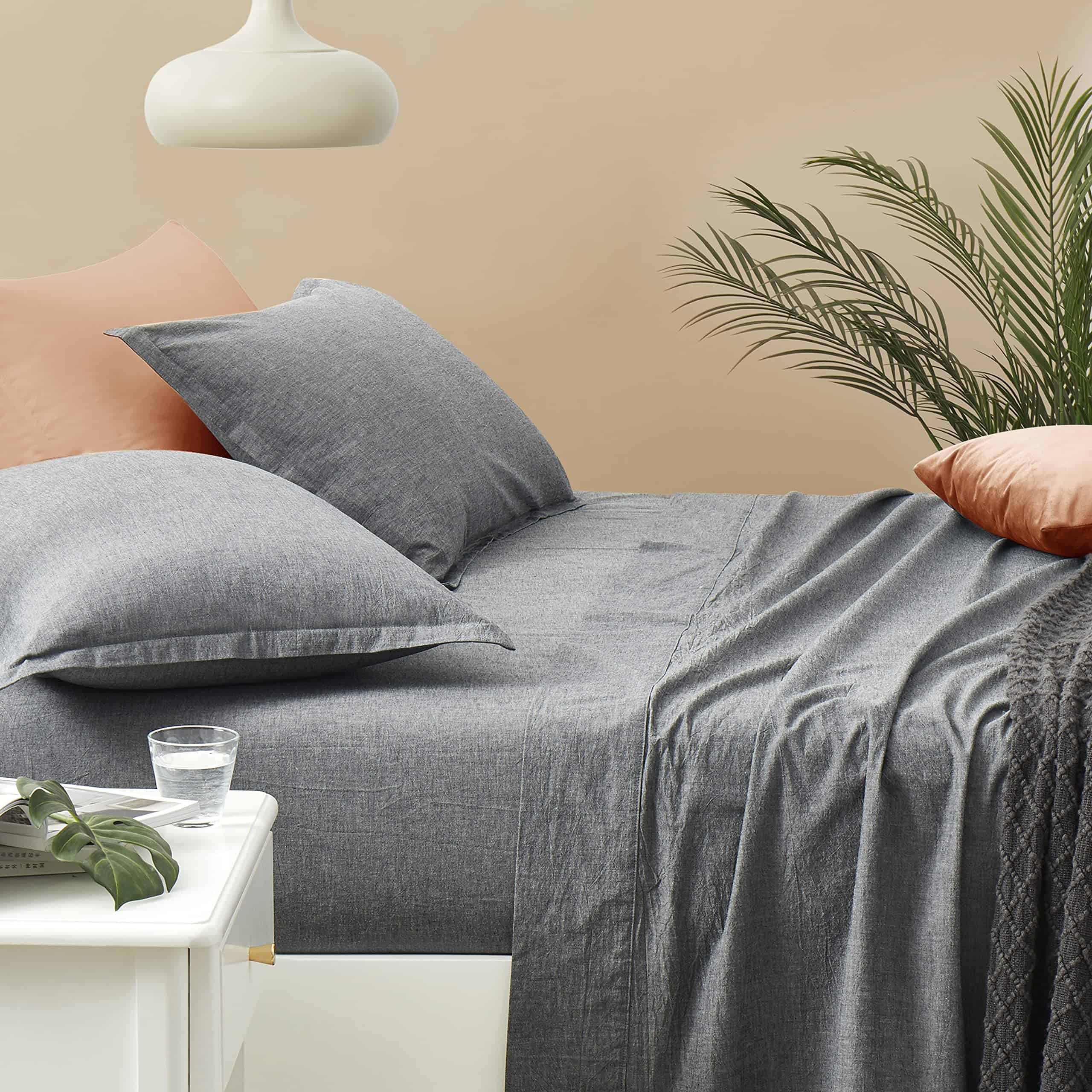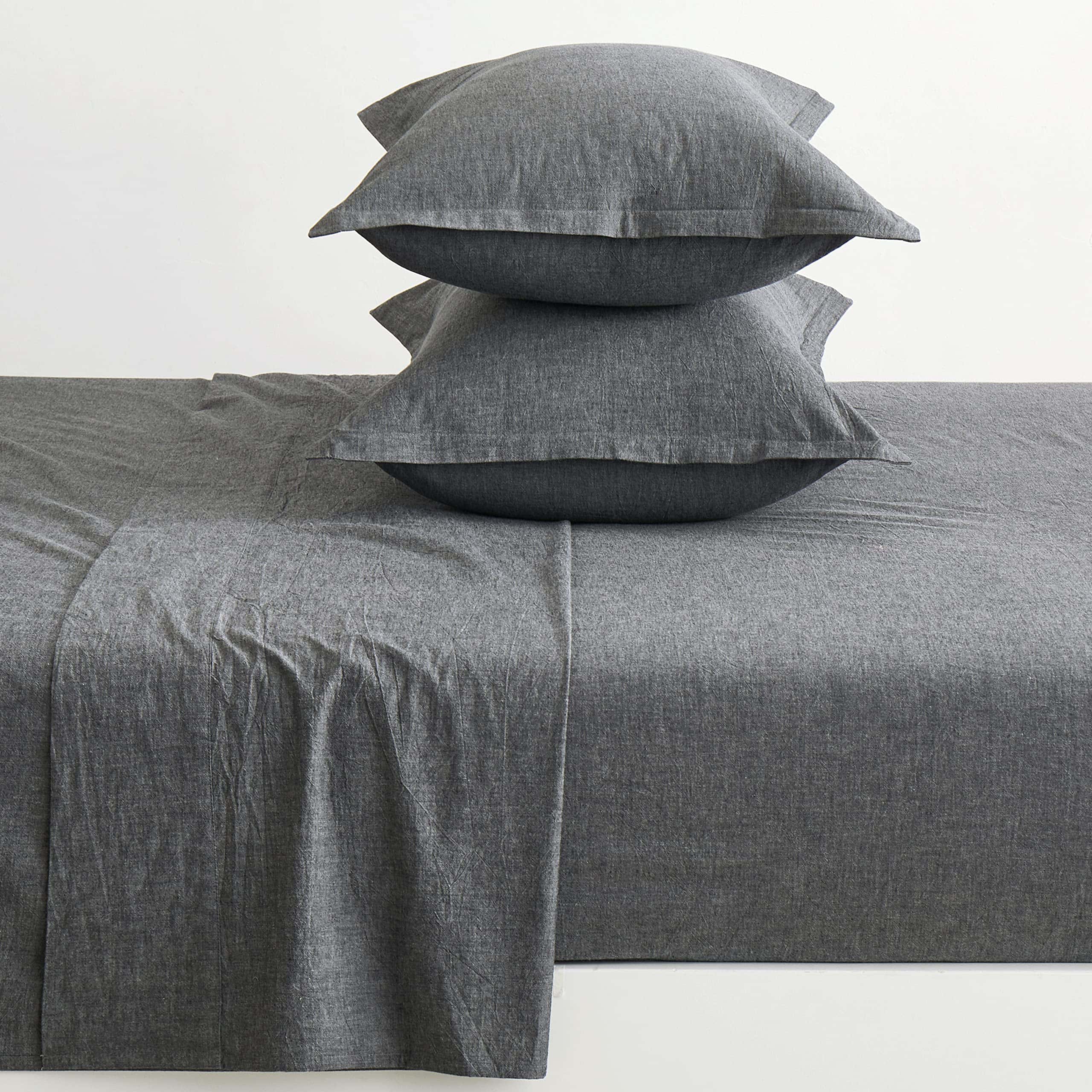Juego de sábana ajustable de chambray de algodón lavado de estilo relajado moderno de Eikei Home. Hecho de suave tela de algodón lavado al 100% en variedad de colores intemporales. Fundas de almohada con ribete y cierre de solapa francesa. Disponible en tamaño US King, Full / Queen y Twin. Tejido de percal resistente a las arrugas y decoloración de color sólido con un aspecto naturalmente arrugado para la máxima comodidad en tu dormitorio. Viene con una bolsa de almacenamiento práctica.