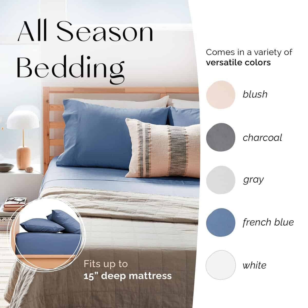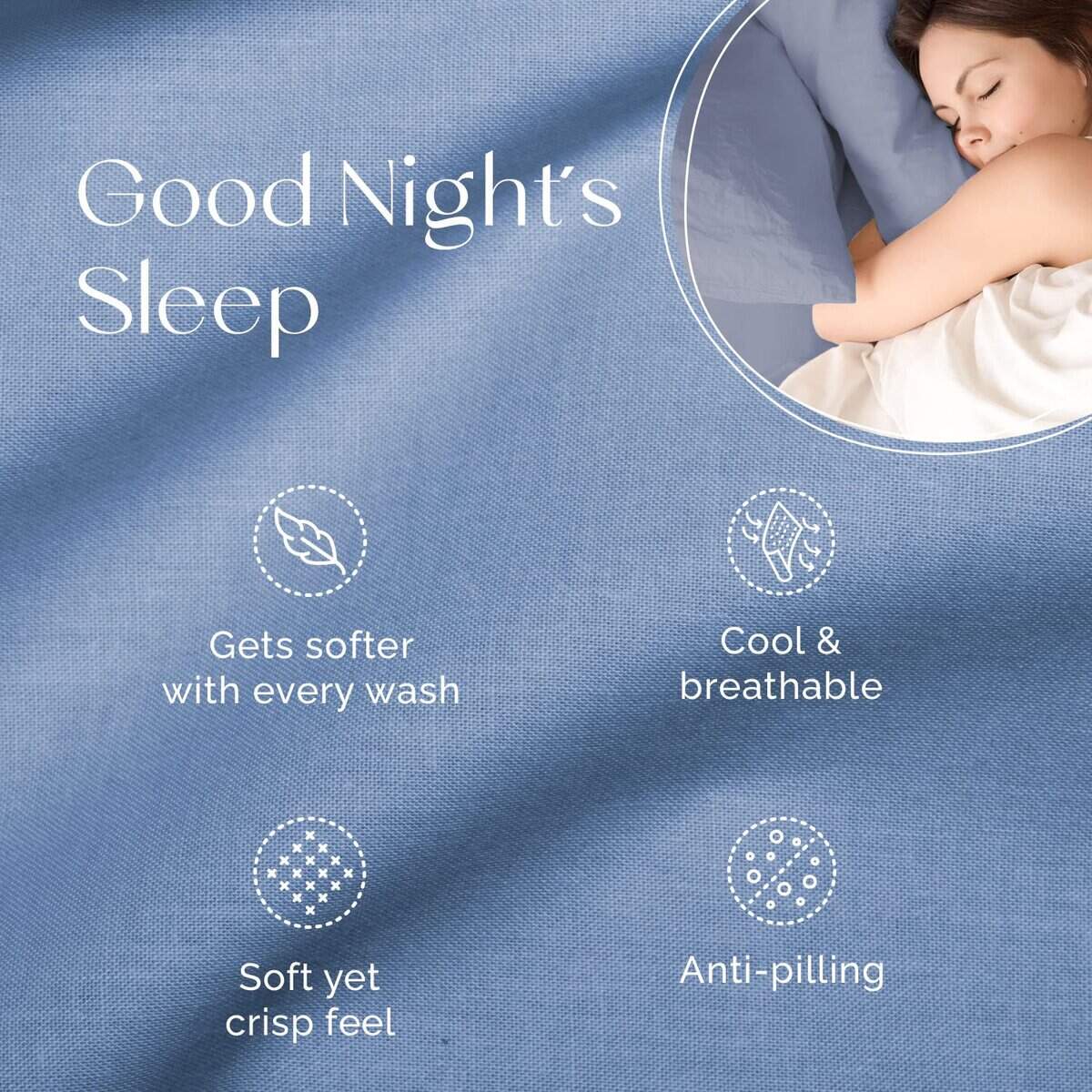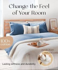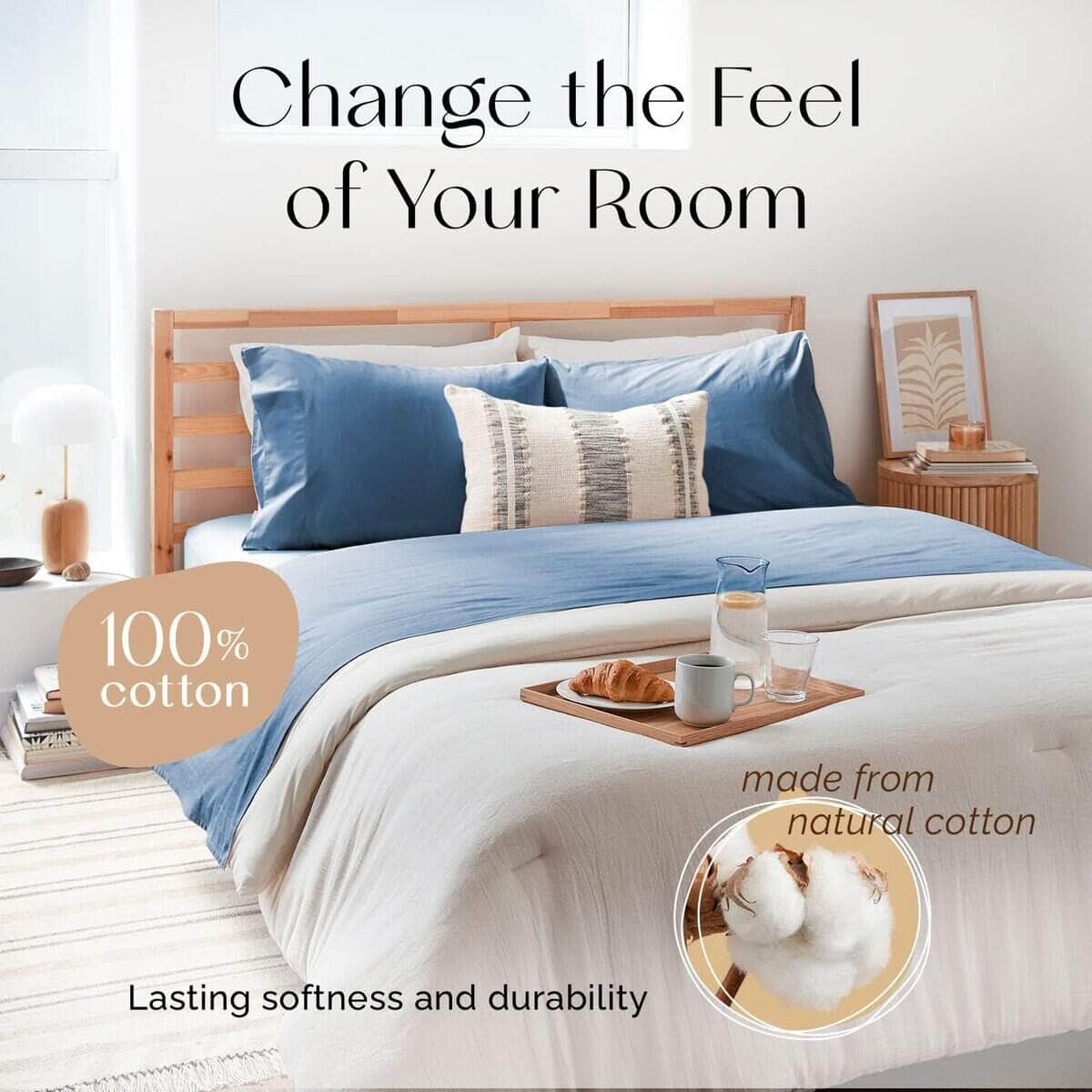 1. Sábanas de algodón tipo lino transpirables: Nuestras sábanas están confeccionadas con algodón de fibra larga para una sensación fresca y limpia, similar al algodón egipcio. Estas sábanas de percal de algodón premium son ideales para una buena noche de sueño, especialmente en verano, y vienen en una variedad de colores para adaptarse o cambiar el ambiente de cualquier habitación.