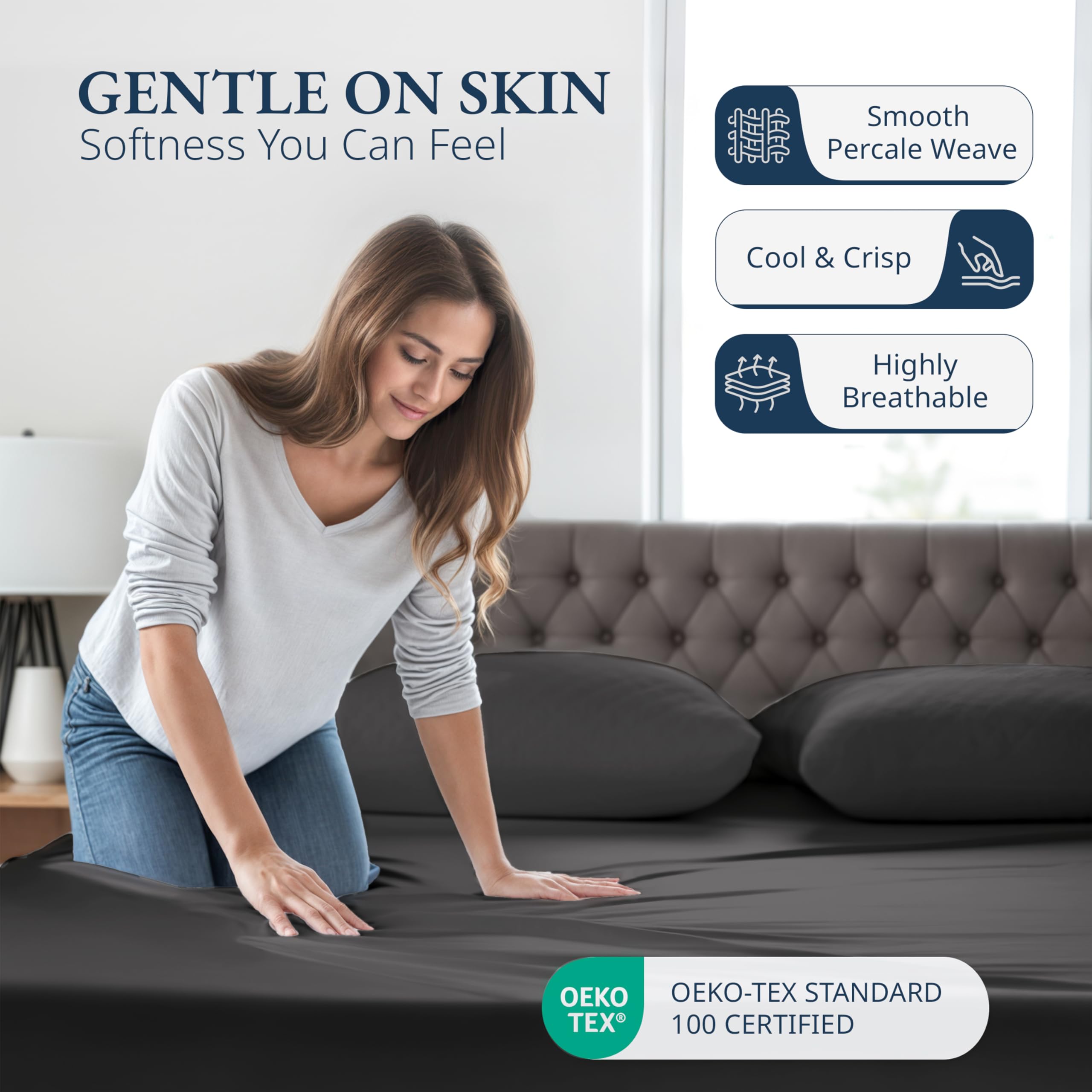 El tejido de percal de este juego de sábana ajustable está fabricado con fibras de algodón orgánico 100%, garantizando resistencia y suavidad al mismo tiempo, para una noche de sueño acogedora en todo momento.