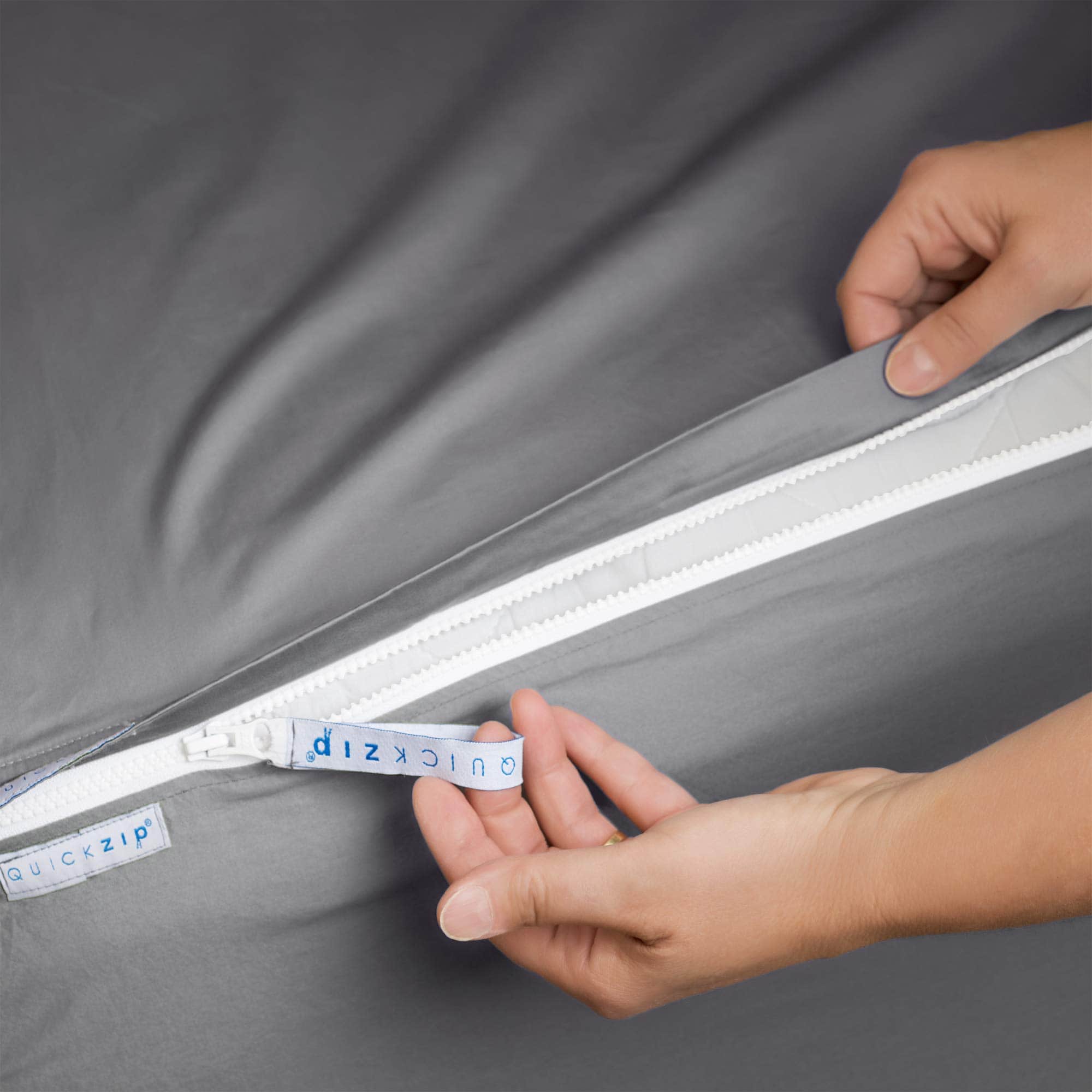Juego de sábana ajustable QuickZip Plus: 1 sábana ajustable (base + sábana con cremallera) y 1 sábana con cremallera, fácil de cambiar y no se desprende, suave percal 400 TC 100% algodón, bolsillos profundos de 15» – Tamaño completo – Gris Pizarra. QuickZip es una sábana ajustable patentada de 2 partes que es conveniente, cómoda y libre de molestias de todas las maneras imaginables. Colocar o cambiar las sábanas ajustables en el colchón nunca será un problema nuevamente. La base de la sábano ajustable está abierta en la parte inferior y abraza perfectamente los lados del colchón, con las esquinas patentadas SuperGrip manteniéndola firmemente en su lugar. Los bolsillos extra profundos de 15», el elástico continuo duradero cabe un colchón tamaño completo de hasta 75» x 54». Las sábanas con cremallera se pueden colocar y quitar fácilmente de la base ajustable con la ayuda de una resistente cremallera YKK que permanece oculta a la vista y viene con una Garantía de Por Vida. Este juego de sábanas completo incluye dos sábanas con cremallera de 400 hilos de algodón peinado de primera calidad y percal 100% algodón tamaño completo que están certificados por OEKO-Tex. NO INCLUYE sábana plana o fundas de almohada. A diferencia de los juegos de sábanas ajustables antiguos que son increíblemente engorrosos de cambiar y lavar, la sábana con cremallera de QuickZip se quita con un movimiento de la cremallera. Es extremadamente fácil de mantener, cambiar, lavar, doblar y guardar. Las sábanas ajustables QuickZip son particularmente útiles para personas con colchones de difícil acceso en camas de esquina, literas, camas nido, literas, camas ajustables. ¡Haga clic en ‘Agregar al carro’ para ordenar hoy!