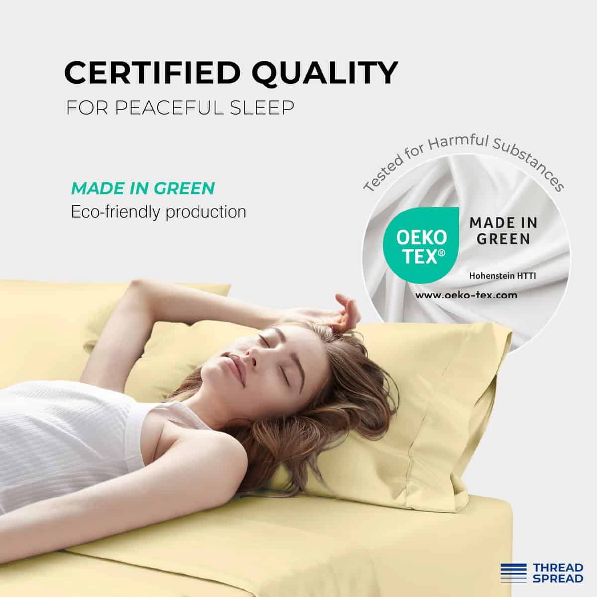 4. Independientemente probado y autenticado para una calidad superior: Thread Spread es reconocido por su alta calidad y autenticidad de hilos. Cada juego de sábanas cal king de algodón egipcio es mercerizado para una verdadera suavidad y durabilidad. Además, nuestras sábanas de algodón egipcio frescas y cómodas para cama California King también son validadas de forma independiente por OEKO-TEX para estar libres de sustancias nocivas, por lo que son perfectas para niños, adultos y familias por igual.
