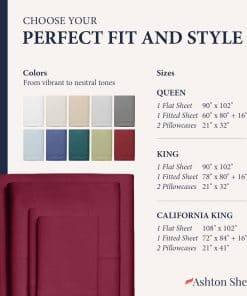 4. Disfruta del Completo Juego de Sábanas de Lujo de 4 Piezas: El juego de sábanas de algodón egipcio tamaño California King de Ashton Sheets incluye 4 piezas – 1 sábana plana (102″ x 108″), 1 sábana ajustable (72″ x 84″ + 17″), y 2 fundas de almohada tamaño king (21″ x 41″). La sábana ajustable elástica viene con un bolsillo extra profundo de 17 pulgadas para adaptarse fácilmente a colchones regulares y altos de hasta 19 pulgadas. Las fundas de almohada tienen un cierre abierto para que las almohadas grandes puedan deslizarse fácilmente.