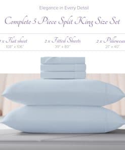2. Bolsillos extra profundos con elástico para un ajuste perfecto: Gira y gira en la noche y la sábana ajustable no se saldrá. Nuestras fundas de almohada se ajustan perfectamente a las almohadas y las sábanas tamaño split king se ajustan a colchones ajustables de hasta 16 pulgadas de profundidad. Las etiquetas inteligentes te indican qué lado van las sábanas de algodón egipcio para que puedas hacer la cama fácilmente. Nuestro juego de sábanas split king de 5 piezas incluye una sábana plana (108″ L x 106″ W), dos sábanas ajustables (39″ W x 80″ L + 16 pulgadas de bolsillo profundo) y dos fundas de almohada (21″ W x 40″ L).