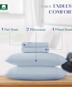 Este juego de sábanas California King viene completo con 4 piezas para una solución integral de ropa de cama. Incluye una sábana plana generosamente dimensionada, una sábana ajustada con bolsillo extra profundo para adaptarse a colchones de hasta 19 pulgadas de grosor, y dos fundas de almohada tamaño king con cierre abierto para facilitar la inserción de almohadas. Su peso sustancial y grosor te transportarán a un nivel de lujo que usualmente solo se encuentra en hoteles de clase mundial, como The Ritz Carlton o The Plaza.