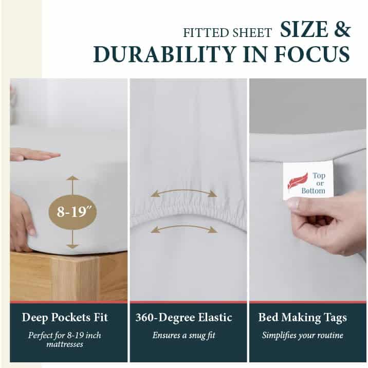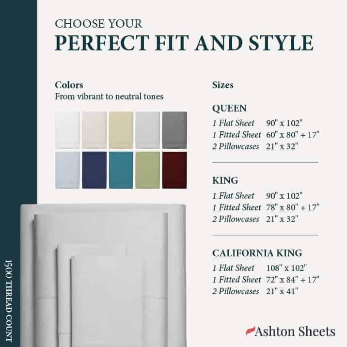 Disfrute del completo juego de sábanas de lujo de 4 piezas: El juego de sábanas de algodón egipcio tamaño Queen de Ashton Sheets incluye 4 piezas – 1 sábana plana (90″ x 102″), 1 sábana ajustable (60″ x 80″ + 17″), y 2 fundas de almohada tamaño Standard / Queen (21″ x 32″) que incluyen un cierre de sobre para asegurar las almohadas. La sábana ajustada elástica tiene un bolsillo extra profundo de 17 pulgadas para acomodar fácilmente colchones normales y altos de hasta 19 pulgadas. Las fundas de almohada tienen un cierre abierto para que las almohadas grandes se deslicen fácilmente.