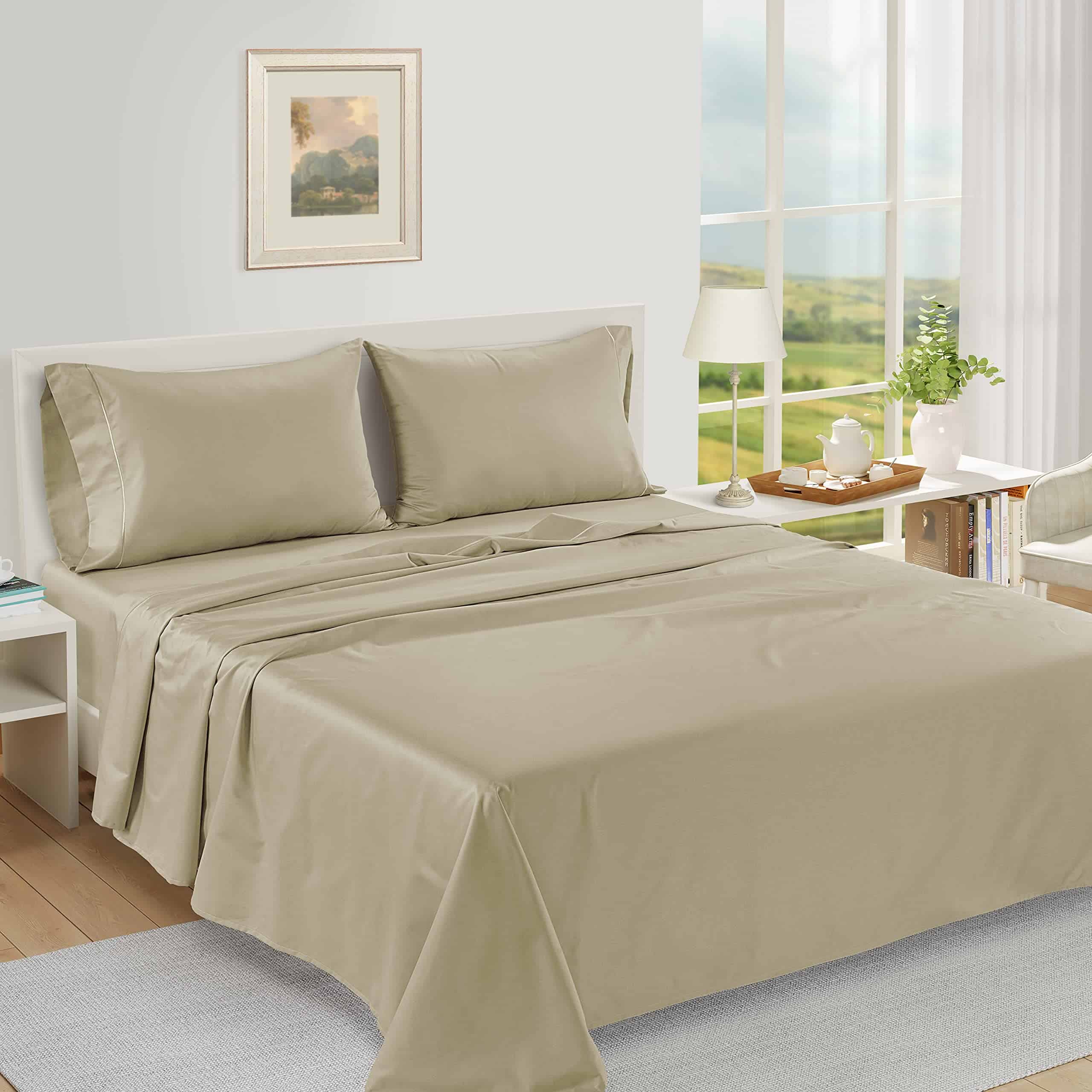 3. Sábanas transpirables y frescas: Experimenta un sueño sereno en estas sábanas de lujo, sábanas de algodón egipcio con recuento de hilos 1000 tamaño completo con bolsillos profundos, que ofrecen una excelente transpirabilidad y regulan la temperatura durante toda la noche. Con un enfoque tanto en la comodidad como en la estética, estas sábanas extra grandes con bolsillos profundos tienen un diseño elegante y atemporal que complementa fácilmente cualquier decoración de dormitorio añadiendo un toque de sofisticación a tu espacio para dormir.