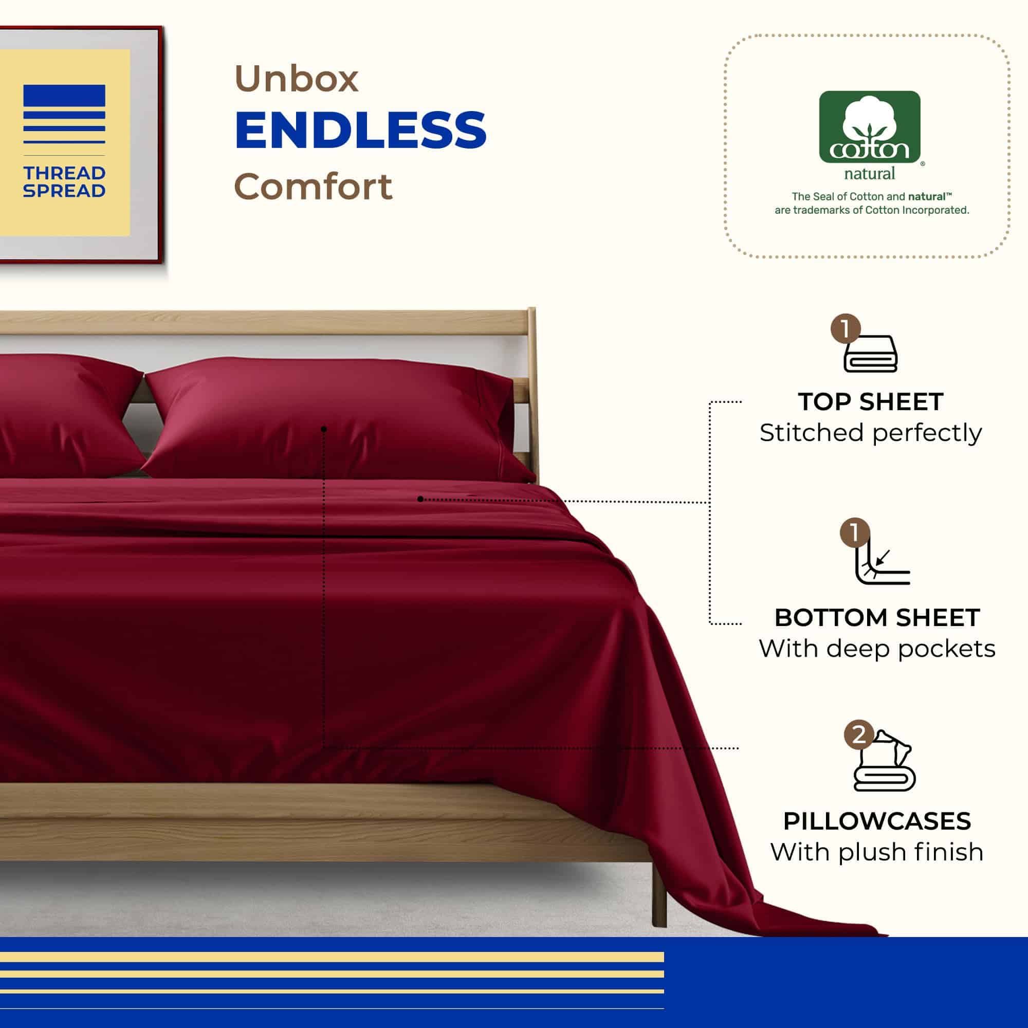 Juego de sábanas borgoña para cama Queen de algodón egipcio de Thread Spread: Experimenta la grandeza de la indulgencia de 5 estrellas cuando duermes en estas sábanas de algodón egipcio de 1000 hilos. Nuestro juego de sábanas para cama queen te ayudará a tener una noche de sueño más reparadora y son más transpirables en caso de que sufras de sudores nocturnos. Pasas un tercio de tu vida en tu cama, ¡te mereces unas sábanas queen que sean las mejores! Estas mejores sábanas están disponibles en varios colores y tamaños como Twin, Twin Extra-largo, Full, Queen, King, Split King y California King. Este juego de sábanas de algodón incluye: una sábana plana de 90 x 102 , una sábana ajustable de 60 x 80 +16″ que se estira para adaptarse cómodamente a un colchón de 16 de grosor, y dos fundas de almohada de 21 x 32 . — Características de sábanas suaves: Libre de arrugas – Secado rápido – Tratado para liberación de manchas – Reciclable – Protector contra alérgenos – Científicamente comprobado para promover el sueño. — Cómo cuidar las sábanas borgoñas: Tratar las manchas previamente – No lavar la ropa de cama con otros artículos como toallas. – Para obtener resultados óptimos, recomendamos agregar un detergente de alto pH. – Lavar en ciclo de prensa permanente usando agua caliente (mínimo de 140 ). – Usar un ciclo de centrifugado lento si está disponible. – Usar cloro no indicado, si se desea. — Sobre nosotros: En Thread Spread, creemos en la Colaboración Justa y la Total Transparencia, así es como hacemos negocios. Estamos comprometidos con un Proceso de Fabricación Ética asegurando que cada persona que toca nuestros productos sea recompensada justamente por sus esfuerzos. Nuestras instalaciones son evaluadas por auditores de terceros para garantizar que cumplan con las más altas normas de Cumplimiento Social.
