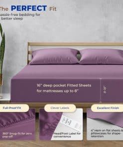 Sábana Queen en ciruela de 1000 hilos de Thread Spread: experimenta la grandeza de la indulgencia de 5 estrellas cuando duermes en estas sábanas de algodón egipcio de 1000 hilos. Nuestro juego de sábanas de tamaño Queen te ayudará a lograr una noche de sueño más reparadora y son más transpirables en caso de sufrir de sudores nocturnos. Pasas un tercio de tu vida en tu cama, ¡te mereces un juego de sábanas Queen que sea el mejor! Estas mejores sábanas de cama están disponibles en múltiples colores y tamaños como Twin, Twin Extra-Largo, Full, Queen, King, Split King y California King. Este juego de sábanas de algodón incluye: una sábana plana de 90 x 102, una sábana ajustada de 60 x 80 +16″ que se estira para adaptarse cómodamente a un colchón de 16″ de grosor, y dos fundas de almohada de 21 x 32 pulgadas. — Características de sábanas suaves: sin arrugas – secado rápido – tratadas para liberación de manchas – reciclables – protectoras contra alérgenos – científicamente comprobado que favorecen el sueño. — Cómo cuidar las sábanas en ciruela: tratar previamente las manchas – no lavar la ropa de cama con otras prendas como toallas. – Para obtener resultados óptimos, recomendamos agregar un detergente de pH alto. – Lavado en ciclo permanente con agua caliente (mínimo de 140°). – Usar ciclo de centrifugado lento si está disponible. – Usar blanqueador sin cloro, si se desea. — Sobre nosotros: en Thread Spread, creemos en la colaboración justa y la total transparencia, así es como hacemos negocios. Estamos comprometidos con un proceso de fabricación ético que asegura que cada persona que toca nuestros productos sea recompensada justamente por sus esfuerzos. Nuestras instalaciones son evaluadas por auditores externos para garantizar que cumplan con los más altos estándares de cumplimiento social.