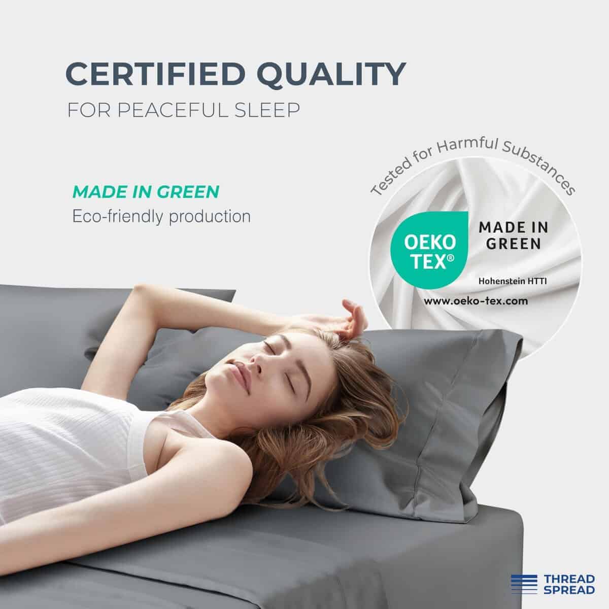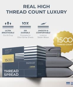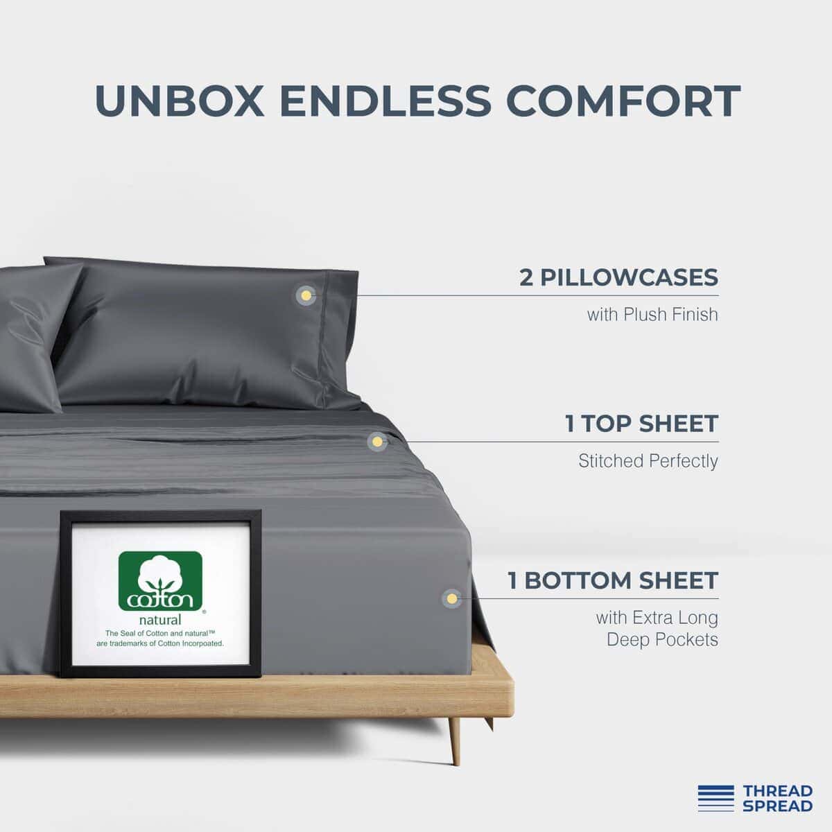 Indulge in Unrivalled Elegance Resembling Opulent 7-Star Retreats: Immerse yourself in the lavish embrace of our queen sheet set Egyptian cotton, exuding a weighty, sumptuous feel that echoes the grandeur of exclusive 7-star havens. The opulent sateen weave bestows a resplendent sheen upon the fabric, delivering a sensorial experience of the most prestigious hotel suites. Crafted for those with discerning tastes, these Egyptian cotton sheets queen size offer unrivalled luxury and comfort. Tailored to Perfection for a Seamless Fit on Your Mattress: Precision-engineered for a flawless fit, Thread Spread�s Egyptian cotton sheet set features an elasticized fitted sheet with deep 17-inch pockets, effortlessly accommodating standard and tall mattresses up to 19 inches. Embracing every curve of your bed with finesse, our 4-piece high thread count queen sheet set comprises 1 flat sheet (90″ x 102″), 1 fitted sheet (60″ x 80″ + 17″ + deep pocket), and 2 pillow cases (21″ x 32 ). Exclusively Authenticated for Exemplary Quality and Purity: At Thread Spread, we uphold the highest standards of excellence and authenticity. Each queen bedsheets set undergoes meticulous mercerization, imparting genuine softness and durability. Independently validated by OEKO-TEX, our deep pocket luxury queen sheets are certified free from harmful substances, ensuring a peaceful and luxurious sanctuary for you and your loved ones. Care Instructions Fit for Royalty: Unleash the full splendour of your Egyptian cotton luxury sheets for queen size bed with our care instructions tailored for royalty. Machine wash with warm water on a gentle cycle, ensuring separate washes for lasting brilliance. Tumble dry on a low setting to maintain the pristine softness, or indulge in the regal ritual of ironing for a flawless finish. Witness these queen size luxury sheets, growing softer with each loving wash