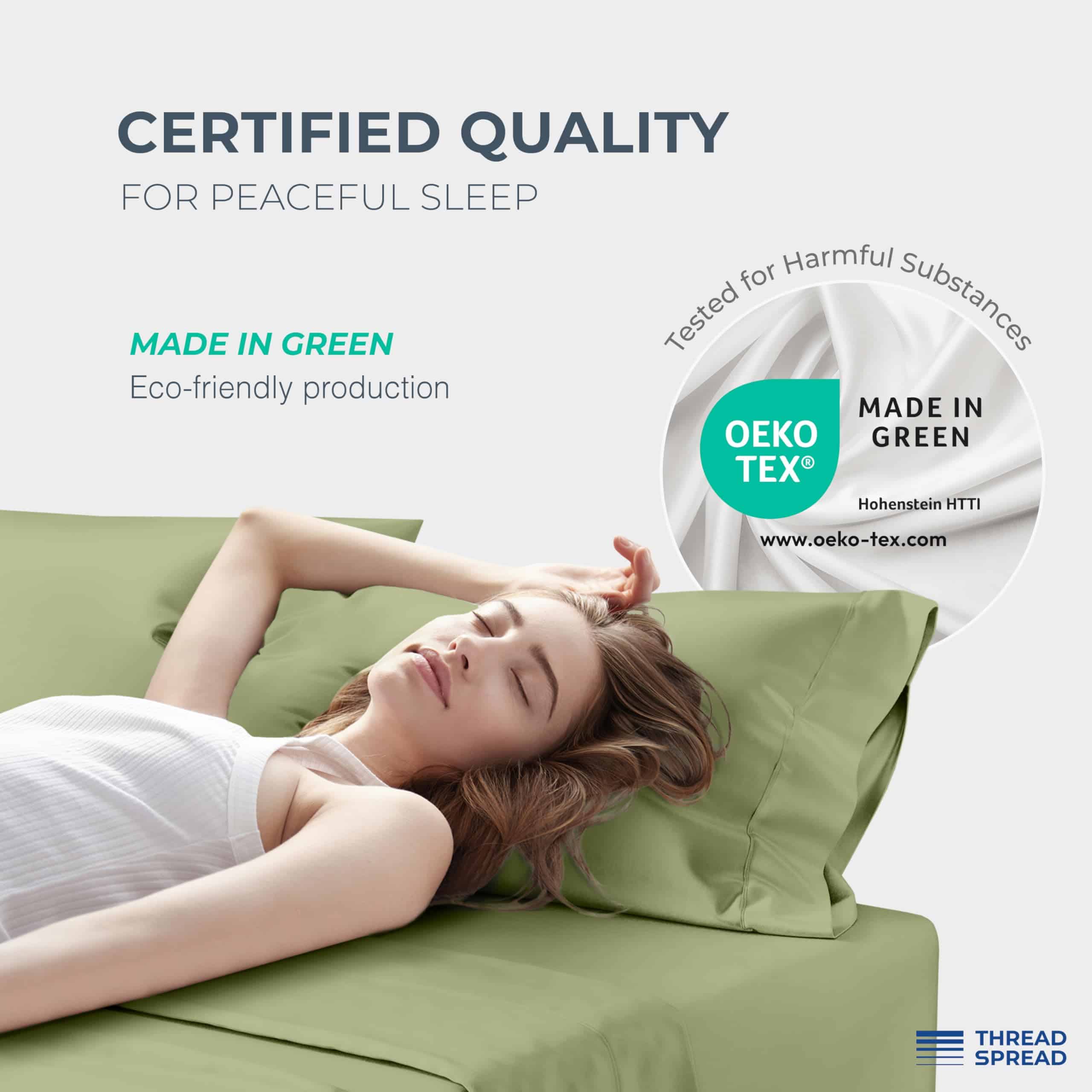 4. Exclusively Authenticated for Exemplary Quality and Purity: At Thread Spread, we uphold the highest standards of excellence and authenticity. Each queen bedsheets set undergoes meticulous mercerization, imparting genuine softness and durability. Independently validated by OEKO-TEX, our deep pocket luxury queen sheets are certified free from harmful substances, ensuring a peaceful and luxurious sanctuary for you and your loved ones.