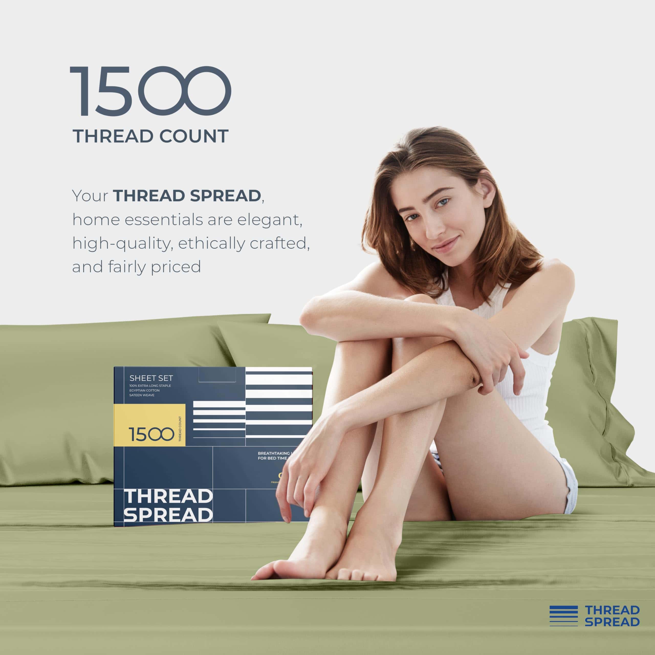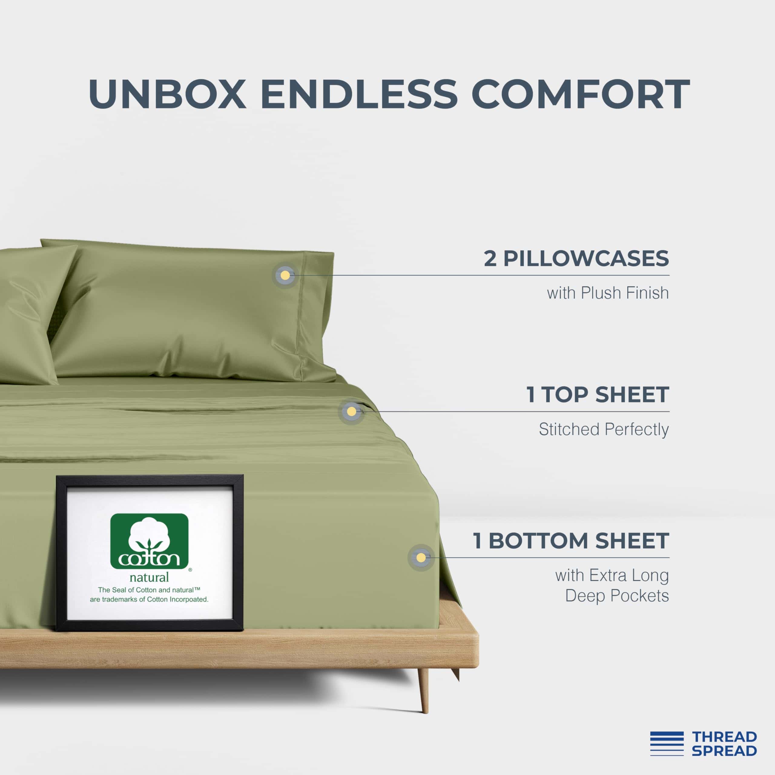 3. Tailored to Perfection for a Seamless Fit on Your Mattress: Precision-engineered for a flawless fit, Thread Spread�s Egyptian cotton sheet set features an elasticized fitted sheet with deep 17-inch pockets, effortlessly accommodating standard and tall mattresses up to 19 inches. Embracing every curve of your bed with finesse, our 4-piece high thread count queen sheet set comprises 1 flat sheet (90″ x 102″), 1 fitted sheet (60″ x 80″ + 17″ + deep pocket), and 2 pillow cases (21″ x 32 ).