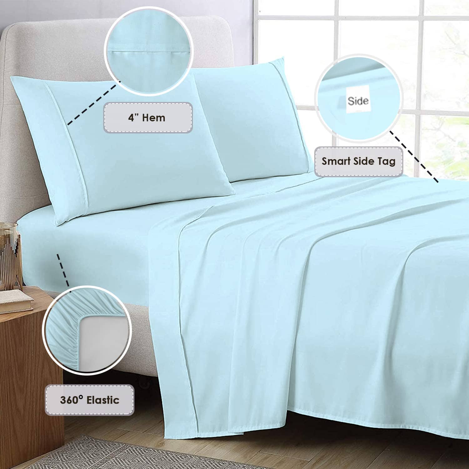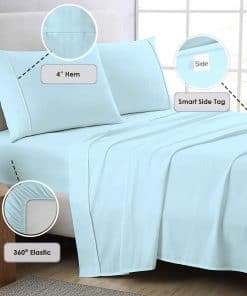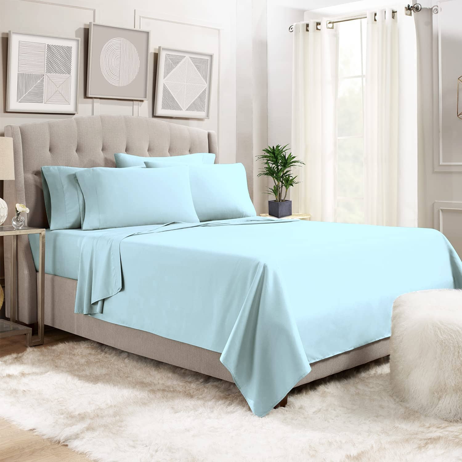 Crea un ambiente de lujo con este juego de sábanas Queen de 6 piezas. Incluye: 1 Sábana Plana Queen (90″ x 102″) – Absorbe rápidamente el sudor y protege de manchas, garantizando frescura al edredón. 1 Sábana Ajustable con bolsillo profundo (60″ x 80″ + 15″) – Cuenta con un exclusivo tejido patentado que tiene un elástico grueso y de alta calidad para un ajuste firme en colchones de 8″ a 15″ de grosor. 4 Fundas de Almohada Queen (20″ x 30″) con un estilo Pizuna con dobladillo de 4″ que da un aspecto elegante y una noche de sueño confortable.