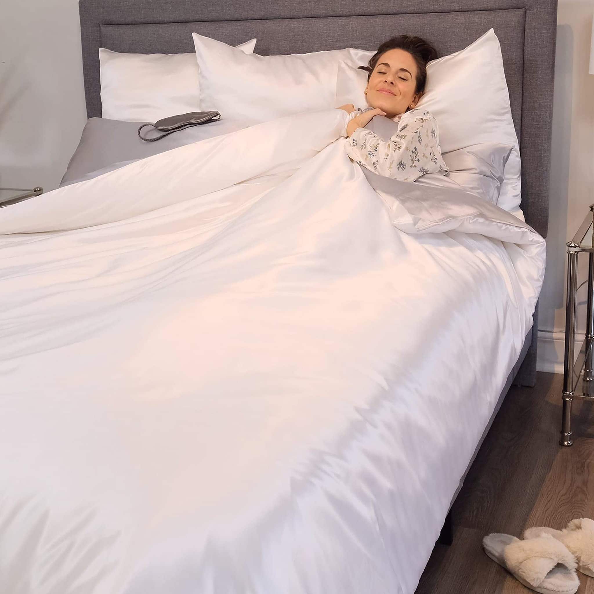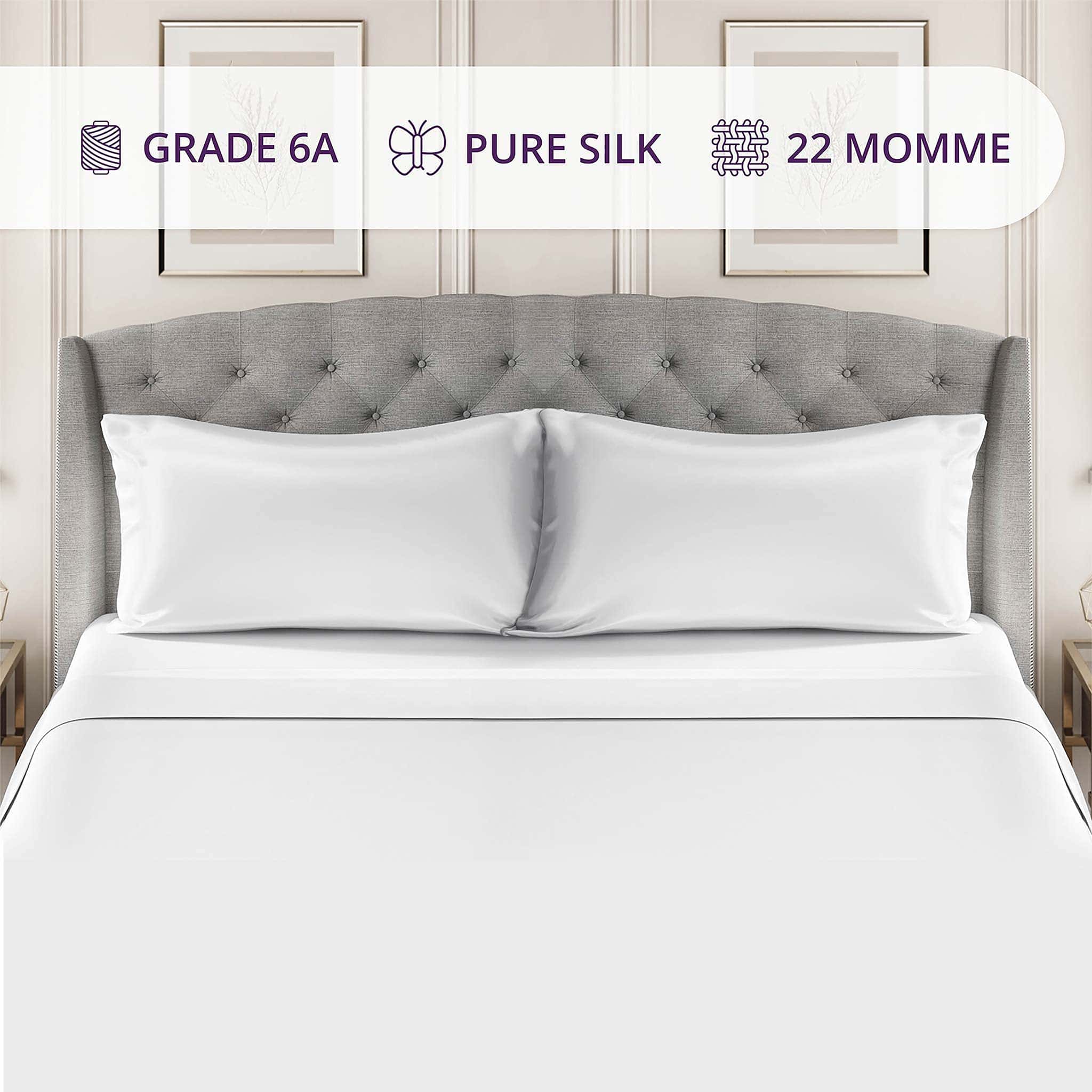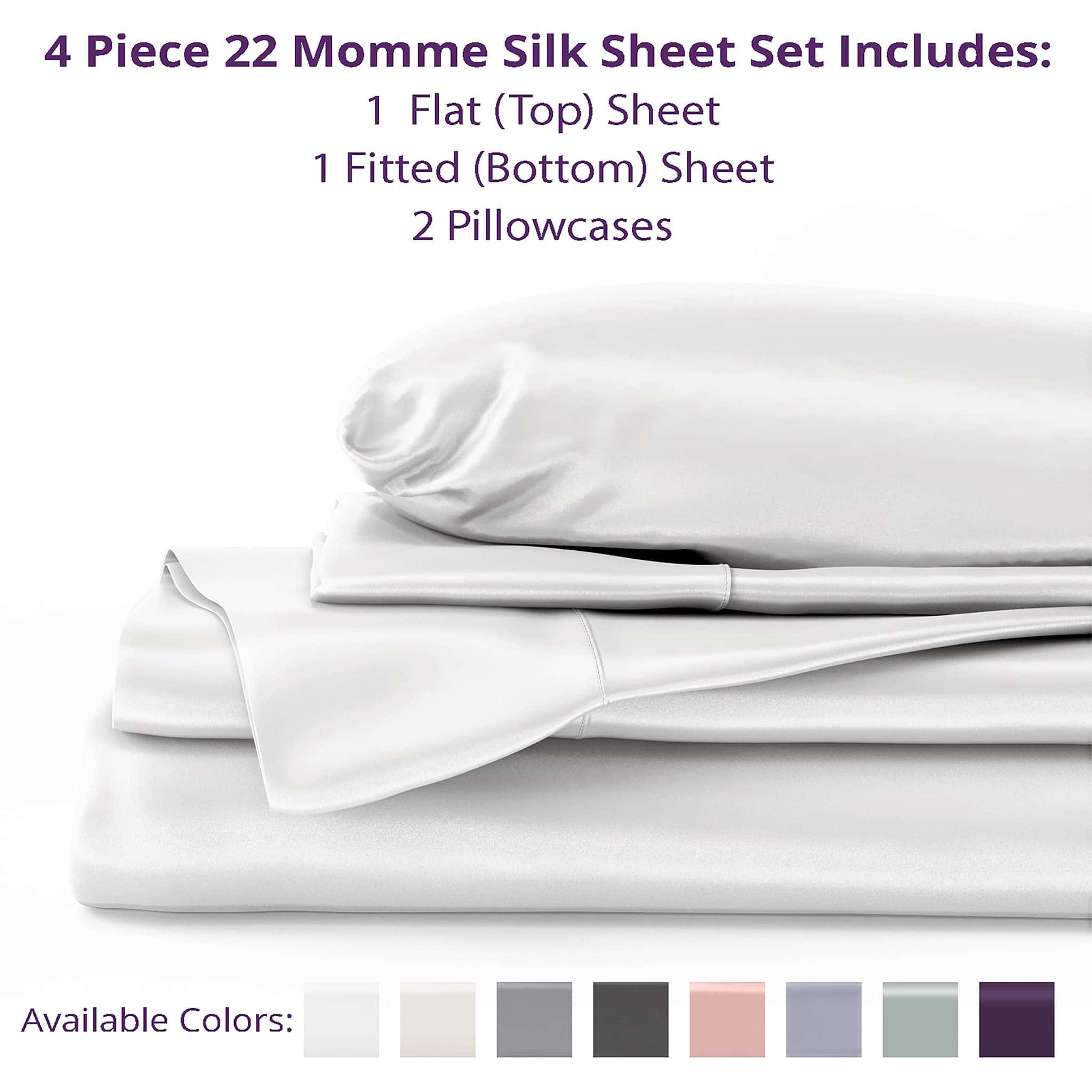 Complete su experiencia de sueño con nuestro juego de sábanas de seda 100% Mulberry Park. Nuestro juego de sábanas de seda de 4 piezas incluye todo lo que necesitas para una comodidad y estilo de lujo. La sábana plana y la sábana ajustable están hechas de seda de morera de grado 6A, que es conocida por ser la mejor calidad de seda disponible en el mercado. Las dos fundas de almohada de seda de doble cara, con cierres estilo sobre extra profundos, garantizan que tu almohada se mantenga en su lugar toda la noche.