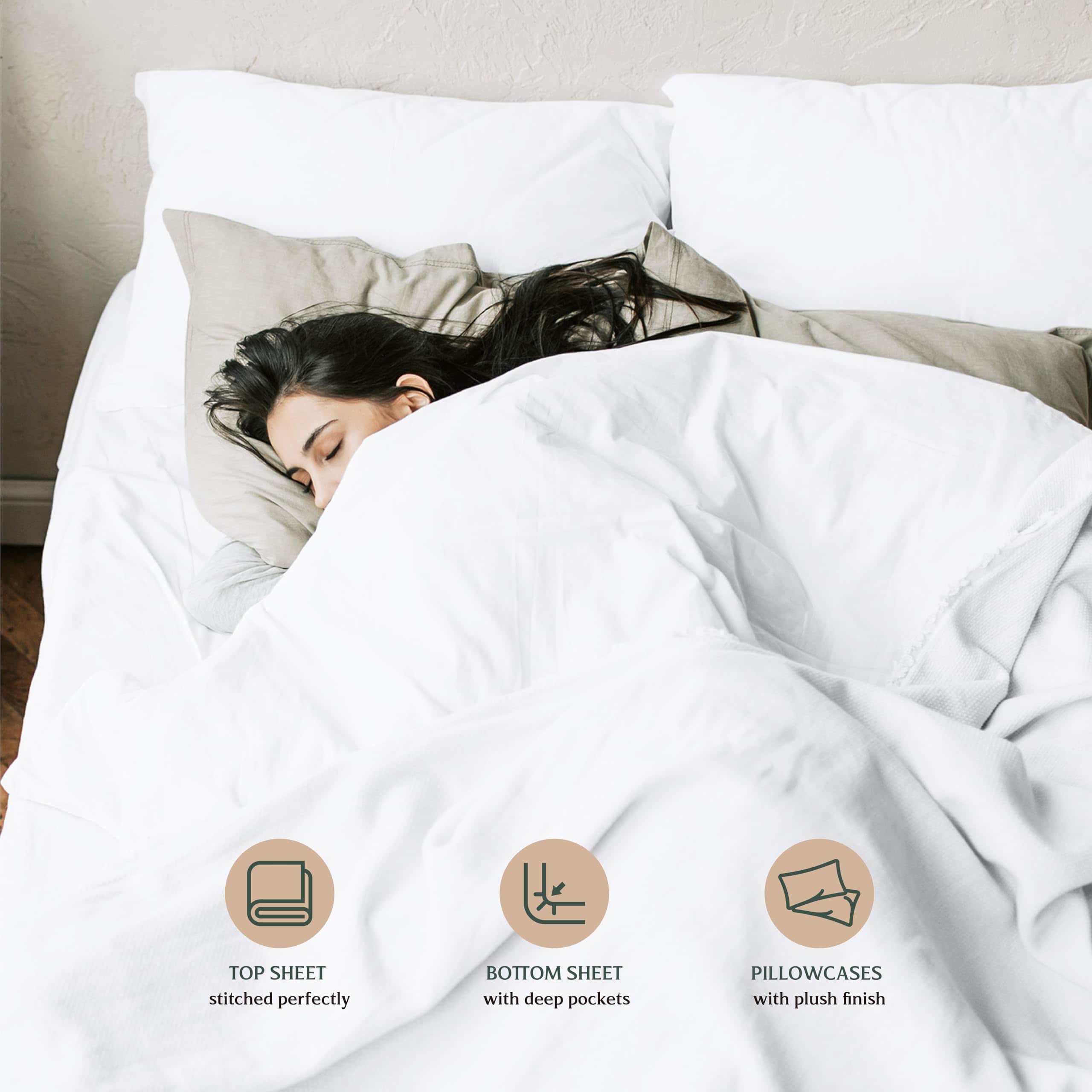 Abraza el juego de sábanas y fundas de almohada seductoramente suave y excepcionalmente sedoso que te hace sentir envuelto en los solapas de las nubes. Nuestras sábanas y fundas de almohada ofrecen un confort inigualable, asegurando una experiencia acogedora cada noche, convirtiéndolas en la elección perfecta para el bienestar general. Las fibras sedosas tienen propiedades termorreguladoras y no retienen el calor para un confort óptimo en verano e invierno. Estas sábanas de lujo son increíblemente ligeras, frescas y súper transpirables, perfectas para parejas que duermen a diferentes temperaturas por la noche. Nuestro juego de sábanas también tiene un ajuste perfecto, gracias al amplio elástico y a los bolsillos profundos que se adaptan a un colchón de hasta 18 pulgadas. Estas sábanas y fundas de almohada son mucho más duraderas y tienden a durar más si se cuidan adecuadamente. Estas sábanas retienen bien el tinte y resisten la decoloración, el apelotonamiento y la contracción. Para obtener los mejores resultados, lava estas sábanas en casa a baja temperatura y sécalas en secadora a baja temperatura. No planchar.