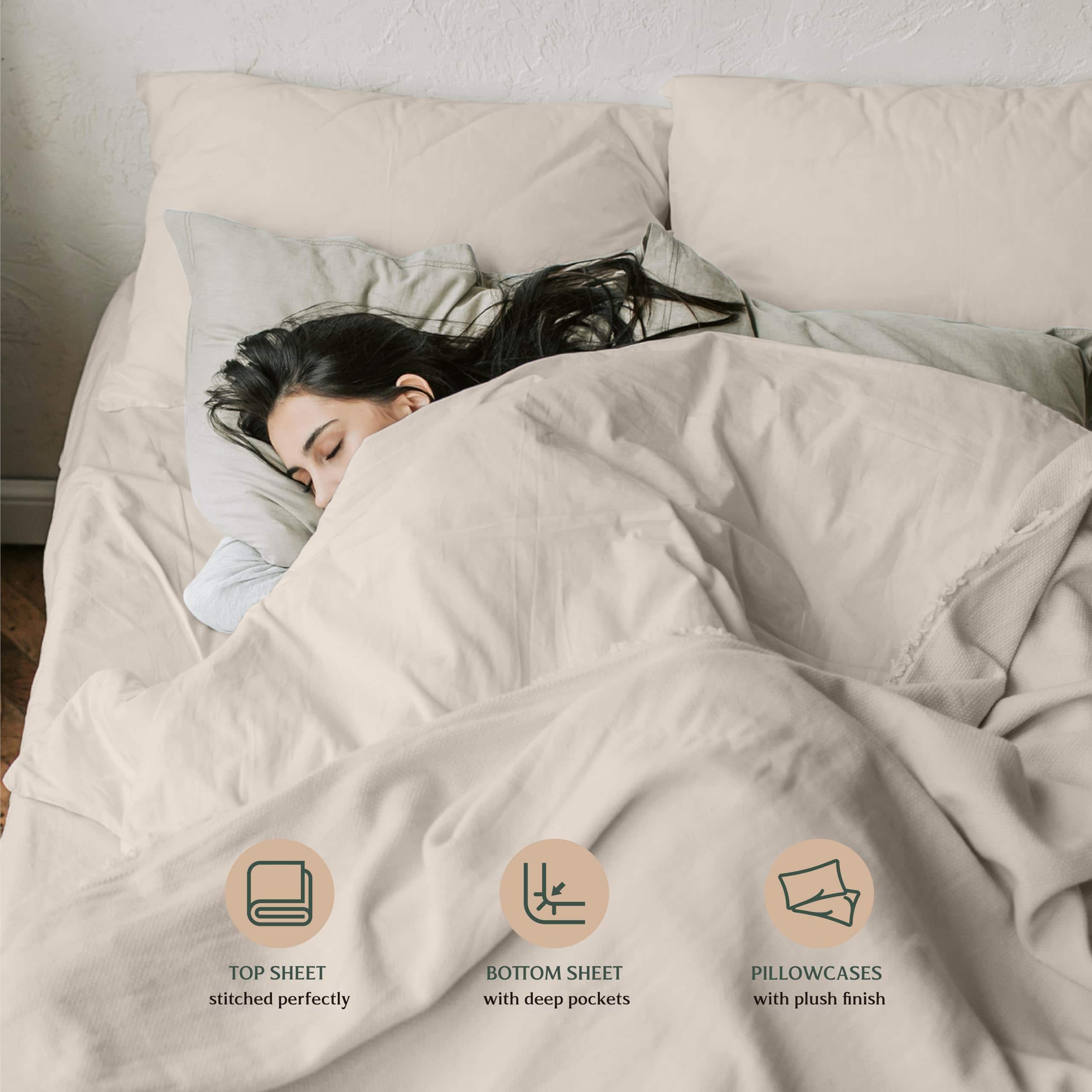 Acepta la suavísima y excepcionalmente sedosa sábana y fundas de almohada que te hace sentir envuelto en las solapas de las nubes. Nuestras sábanas y fundas de almohada ofrecen una comodidad incomparable, asegurando una experiencia acogedora cada noche, lo que las convierte en la elección perfecta para el bienestar general. Las fibras sedosas tienen propiedades termorreguladoras y no retienen calor para un confort óptimo en verano e invierno. Estas sábanas de lujoso son increíblemente ligeras, frescas y súper transpirables, perfectas para parejas que duermen a diferentes temperaturas por la noche. Nuestro juego de sábanas también tiene un ajuste perfecto, gracias al amplio elástico y a los bolsillos profundos que se ajustan a un colchón de hasta 18 pulgadas. Estas sábanas y fundas de almohada son mucho más duraderas y tienden a durar más si se cuidan correctamente. Estas sábanas mantienen bien el tinte y resisten la decoloración, la formación de bolitas y el encogimiento. Para obtener mejores resultados, lava estas sábanas en casa a baja temperatura y sécalas a baja temperatura. No planchar.
