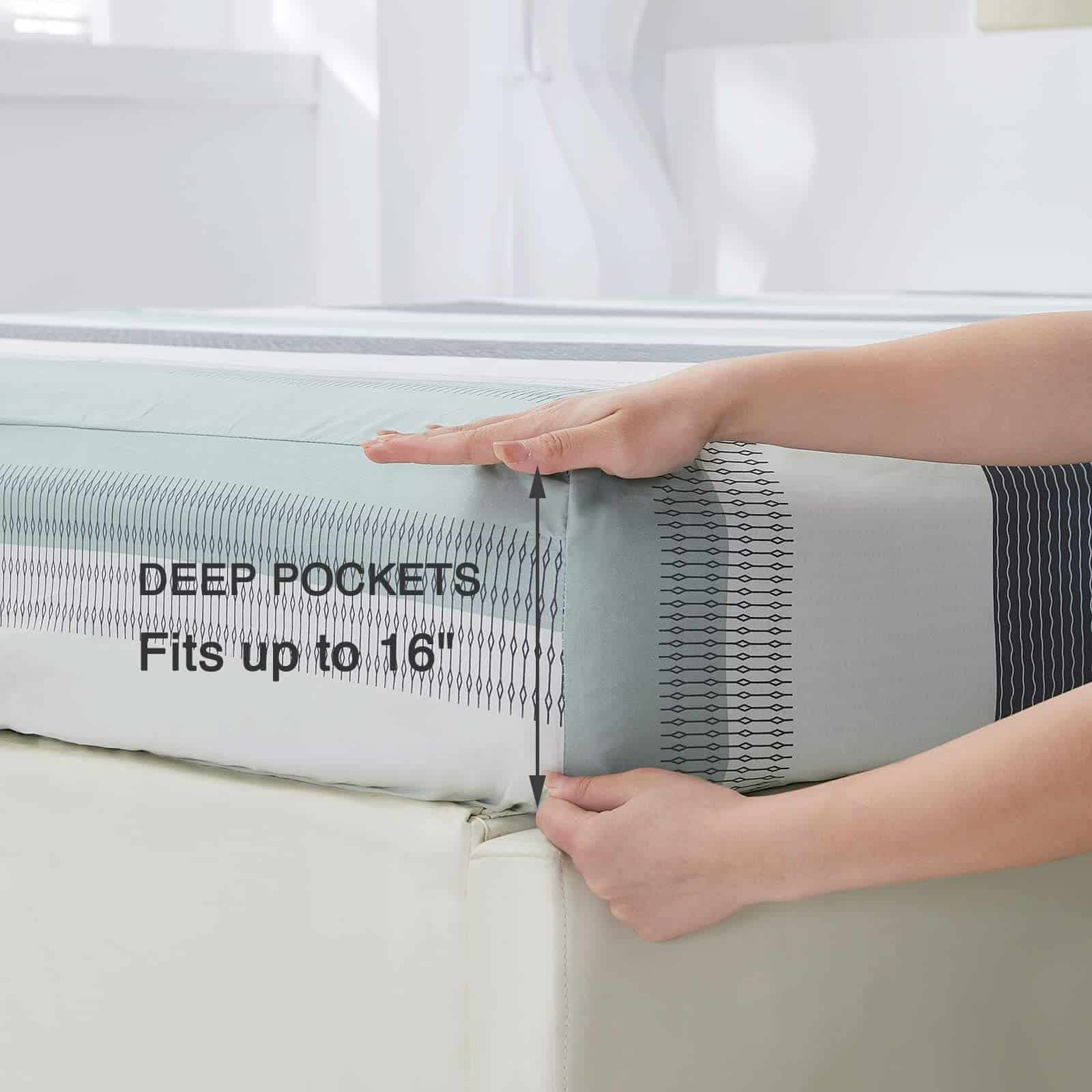 3. Exquisita Artesanía: El tejido plano premium añade resistencia adicional y durabilidad mejorada al 100% de microfibra. Las sábanas con bolsillos extra profundos se adaptan fácilmente al colchón para una experiencia atemporal y placentera.