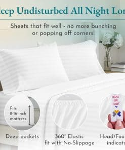 1. Experiencia de sueño de lujo y refrescante: Transforma tu sueño con nuestro juego de sábanas de algodón satinado de 500 hilos, 100% algodón. Mejora el aspecto de tu cama con nuestras sábanas blancas puras, que brindan suavidad, comodidad y transpirabilidad definitivas para una mañana refrescante. 2. Comodidad y salud definitivas: Experimenta sábanas ligeras y que absorben la humedad que promueven un sueño profundo y reparador. Ideal para personas que duermen calientes, nuestras sábanas de algodón de fibra extra larga son suaves, mantecosas y rejuvenecedoras. Disfruta de estas lujosas sábanas tamaño King. 3. Calidad certificada: La suavidad y calidad de nuestras sábanas de algodón han sido verificadas y certificadas. Lavable a máquina, fácil de mantener y certificado Oeko-Tex para tu seguridad. 4. Sábana bajera esencial: ¿Cansado de sábanas que no encajan bien? Nuestra sábana ajustable se adapta a colchones de hasta 16 pulgadas de profundidad con elástico duradero e indicadores fáciles para hacer la cama. Disfruta de un sueño ininterrumpido con nuestra sábana ajustable tamaño King blanca. 5. Nuestro compromiso: En 2022 y 2023, donamos más de 22,000 piezas de ropa de cama a organizaciones benéficas locales en EE. UU. No utilizamos plástico en nuestro empaque y nuestras sábanas se producen en nuestra fábrica de propiedad familiar en India, donde cada pieza es inspeccionada en cuanto a calidad y elaborada con cuidado.