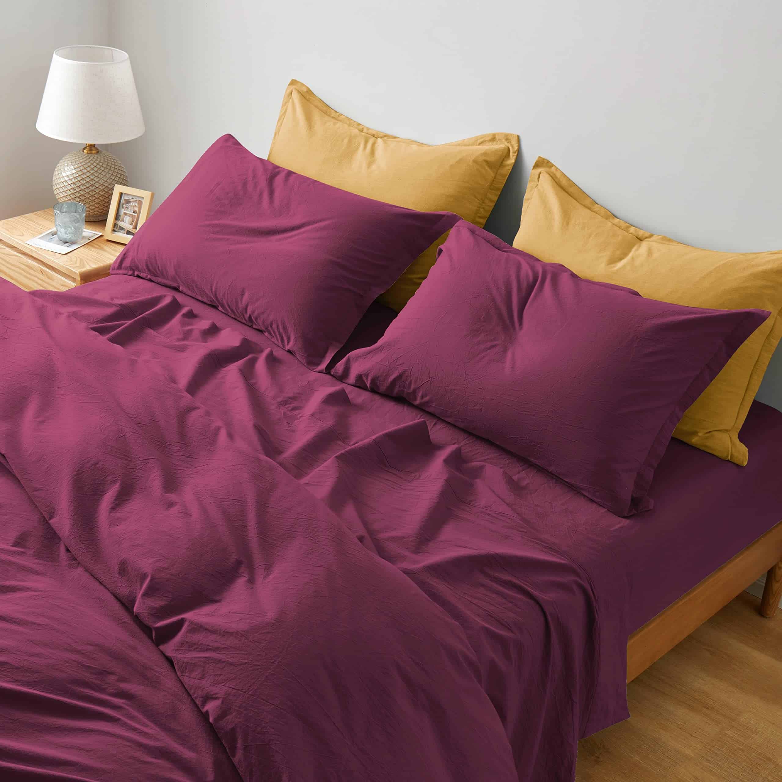 Moderno juego de sábanas ajustables de algodón lavado en chambray de Eikei Home. Fabricado con suave tela de algodón 100% lavado en piedra en una variedad de colores atemporales. Fundas de almohadas con solapa francesa. Disponible en tamaño US King, Full / Queen y Twin. Tejido de percal resistente a la decoloración y las arrugas con un aspecto naturalmente arrugado para una comodidad óptima en tu dormitorio. Viene con una práctica bolsa de almacenamiento.